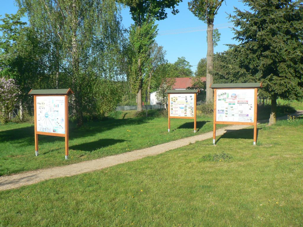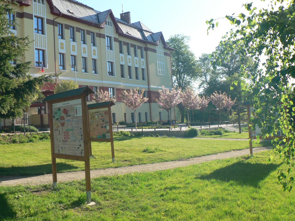 Budova, park a výukové tabule