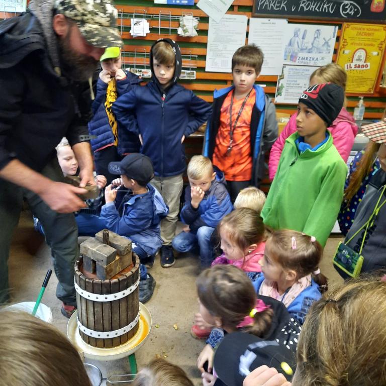 Náš vzdělávací program měl název „Koulelo se koulelo“ –2 tedy s podzimní tématikou, kdy na podzim dozrávají jablíčka a my si z nich mohli vyrobit „domácí“ mošt, jako třeba dnes  - a tady. Hned v úvodu jsme si na zahřátí zazpívali s pořadateli několik známých písní za doprovodu kytary. Pak si děti zopakovaly, jak se takové jablíčko dostane do našeho košíčku. A potom už následovala vlastní samovýroba moštu, na které se podílely všechny děti: naplnit drtičku jablíčky, otáčením v odšťavňovači oddělit jablíčkovou šťávu od jádra. A „výsledek“ byl na světě. Voňavý mošt nalil pan instruktor do skleněných džbánků, poté rozlil do kelímků a pak už jen – na zdraví! Všichni jsme ochutnali tento lahodný nápoj. Ve zbývajícím čase jsme se na zpáteční cestu posilnili svačinou a vydali se na cestu k autobusu.