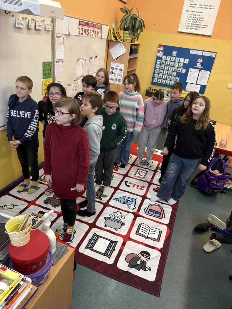 Na začátku besedy paní policistka žákům ukázala tabulku s obrázky, na nichž si společně vysvětlovali, které předměty/obrázky jsou bezpečné a které naopak nebezpečné. Následně paní policistka společně se žáky rozprostřela hrací koberec, na kterém byly stejné obrázky, avšak ve větším měřítku. Každý žák si vybral jeden obrázek a postavil se na něj.