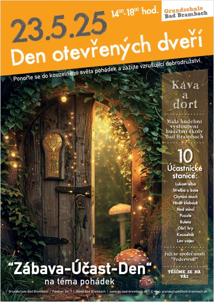 Naše partnerská škola v Bad Brambachu pořádá 23. 5. 2025 od 14:00 do 18:00 den otevřených dveří. Jsou zváni nejen žáci, ale i celé rodiny, o zábavu bude postaráno.