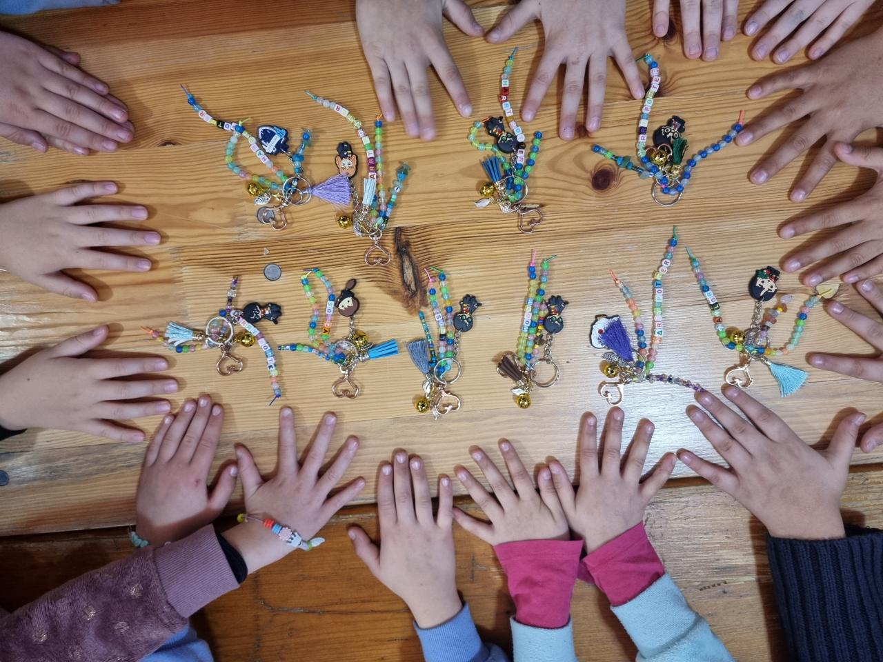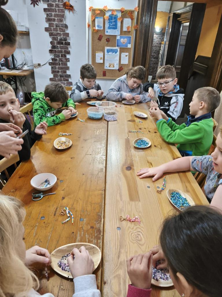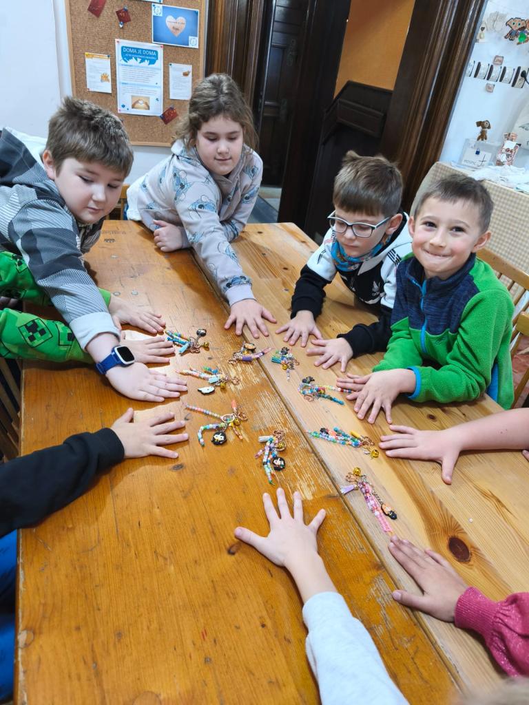 Tentokrát jsme vyráběli potterovský přívěsek na tašku nebo na klíče. Své dovednosti musely děti prokázat především v šikovnosti prstíků. Podle pokynů navlékaly různé druhy korálků na provázky připevněné na karabince a pak další korálky na korálkovou jehlu. Připevnily dále zlatonku s křidélky a Harry přívěsek. U korálků si mohly zvolit v jedné části také korálky s písmeny a poskládat si buď své jméno nebo jméno postav z Harryho. Prověřili jsme si tak, zda už skutečně ovládáme všechna písmena. Důležité při tom bylo také počítat určený počet korálků, aby vše správně pasovalo, takže každý mohl prověřit i své matematické dovednosti. Musím všechny dětičky pochválit, protože se dílo podařilo opravdu všem.