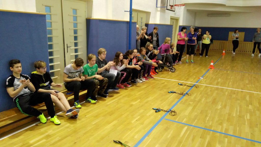tělocvičny. Všichni se moc těšili a s napětím vyhlíželi příchod rodičů. Ano dorazily, bylo jich šest, šest maminek, které si přišly zasportovat. V očích žáků bylo vidět určité zklamání, které však netrvalo dlouho. Do soutěže se zapojili nejen maminky, ale i pan ředitel, učitelé, žáci prvního stupně i bývalí žáci naší školy. Děvčata svým