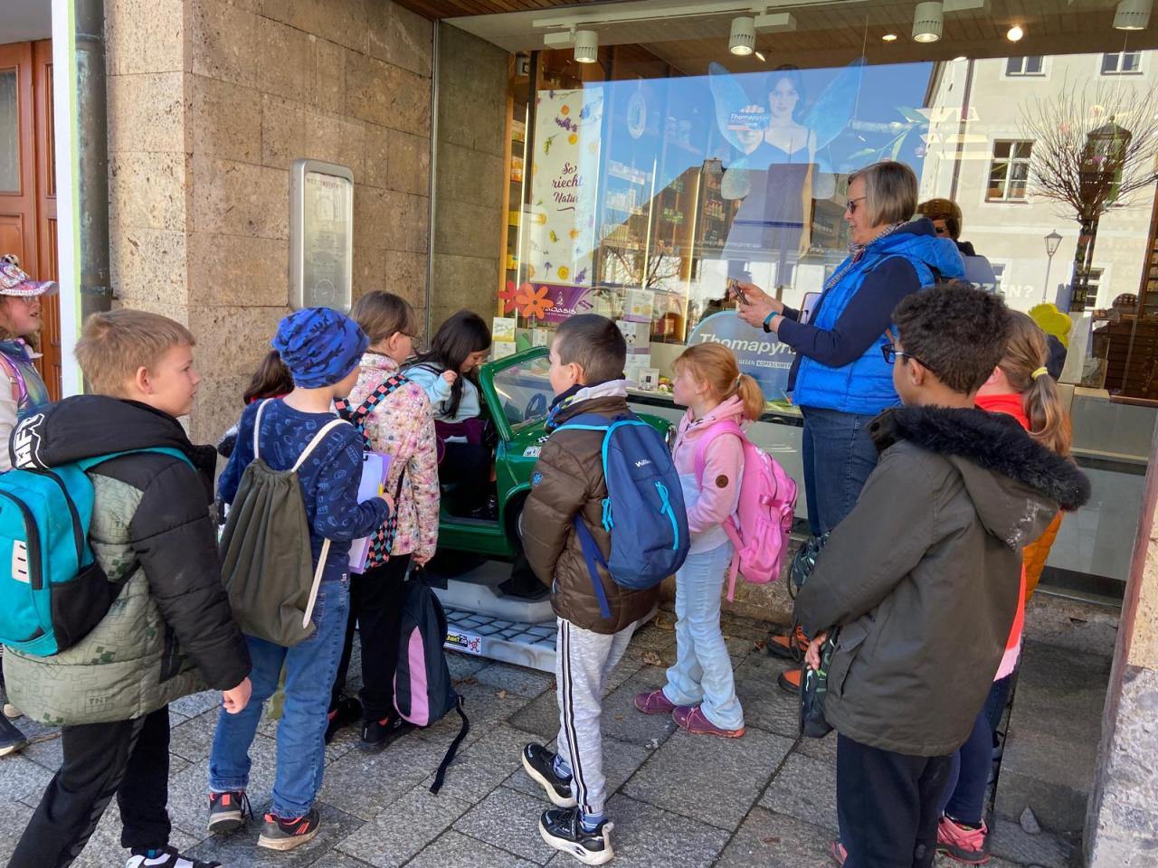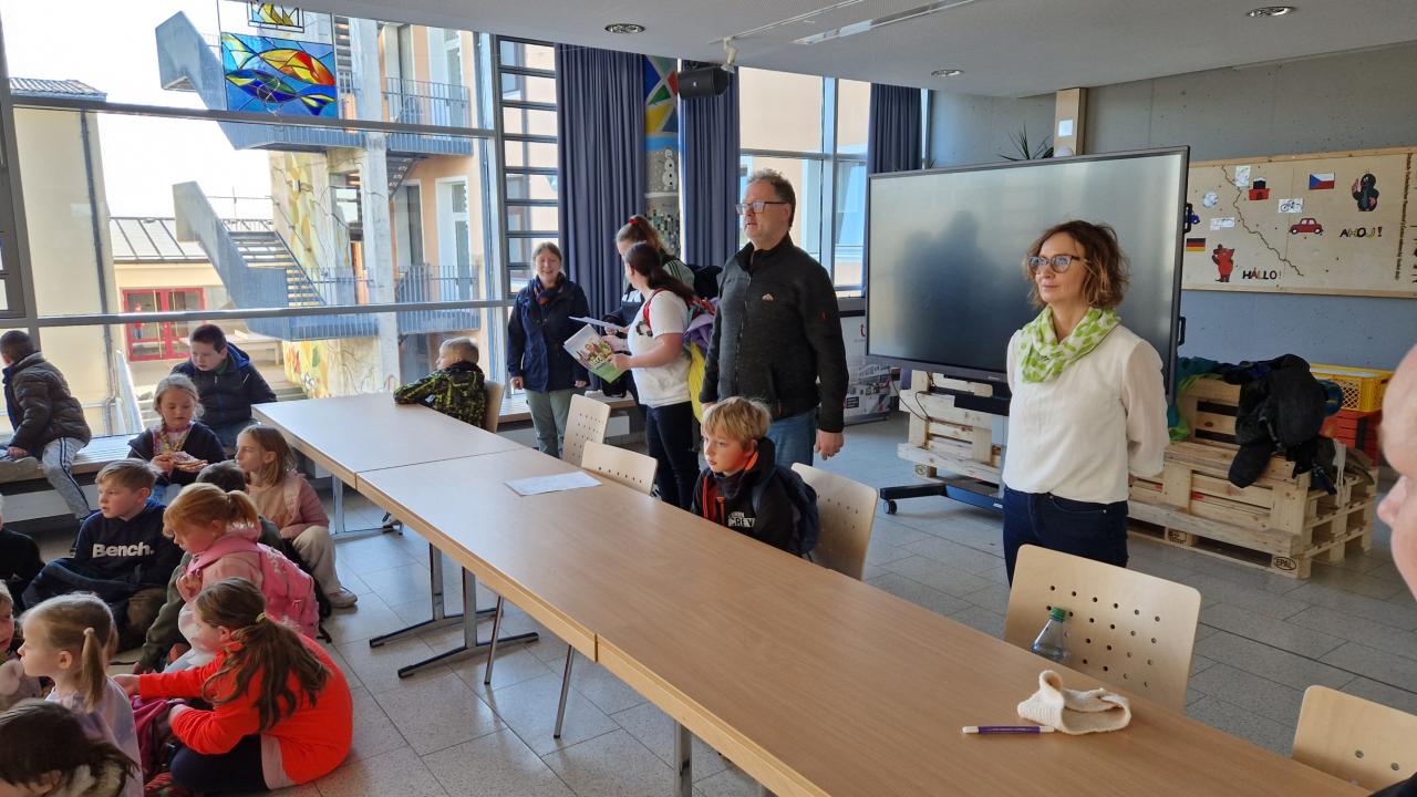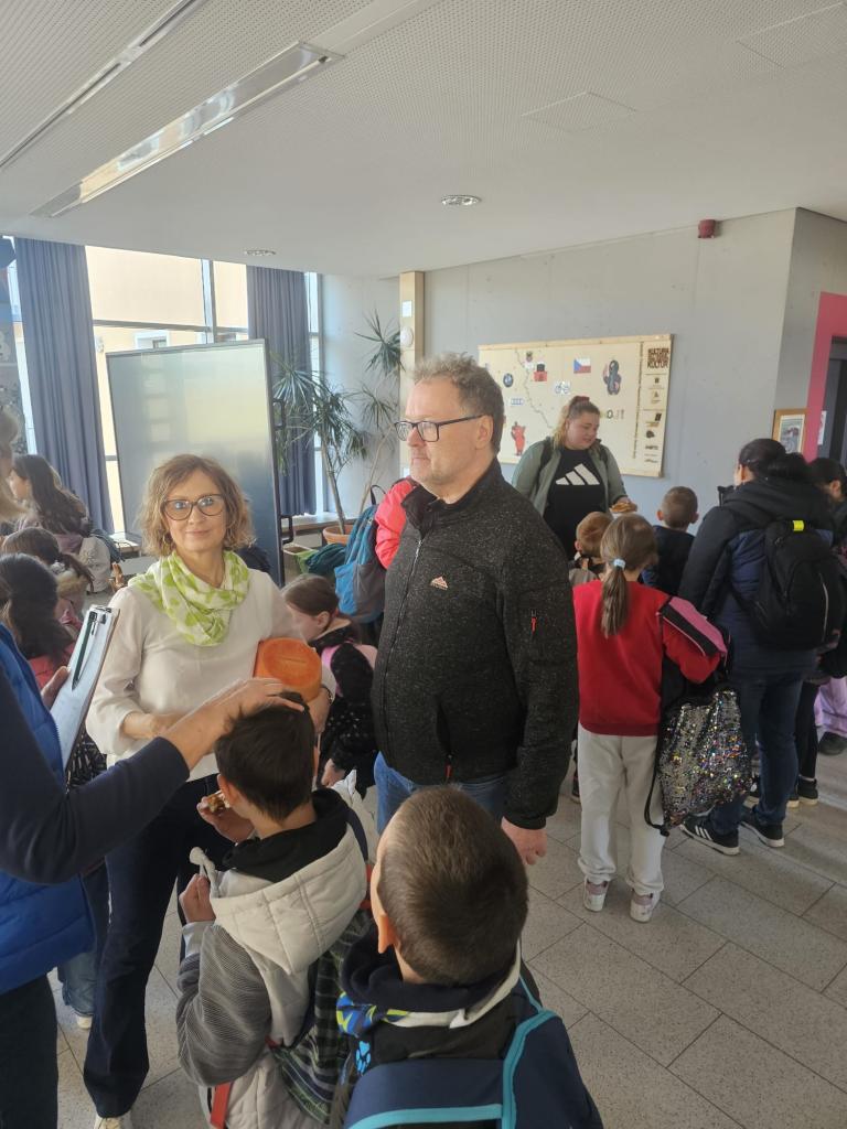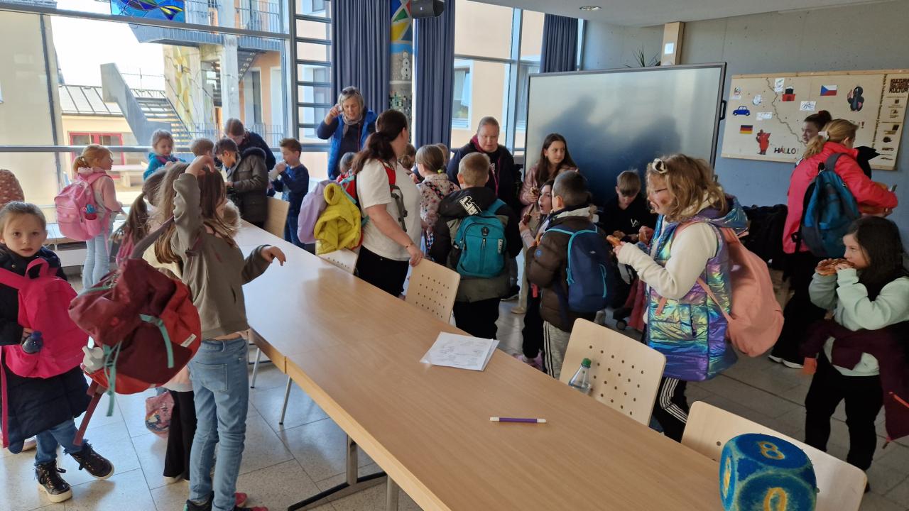 Po zajímavé prohlídce školy dostaly děti chutnou svačinku a vrhly se do plnění úkolů v centru zhruba pětitisícového historického městečka. Děti byly rozděleny do smíšených družstev společně s německými žáky. Úkolem bylo najít různá místa v centru města a odpovídat na otázky. A při plnění úkolů také čile německy i česky komunikovaly.