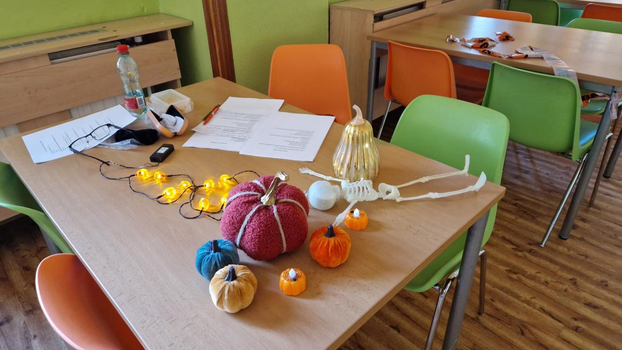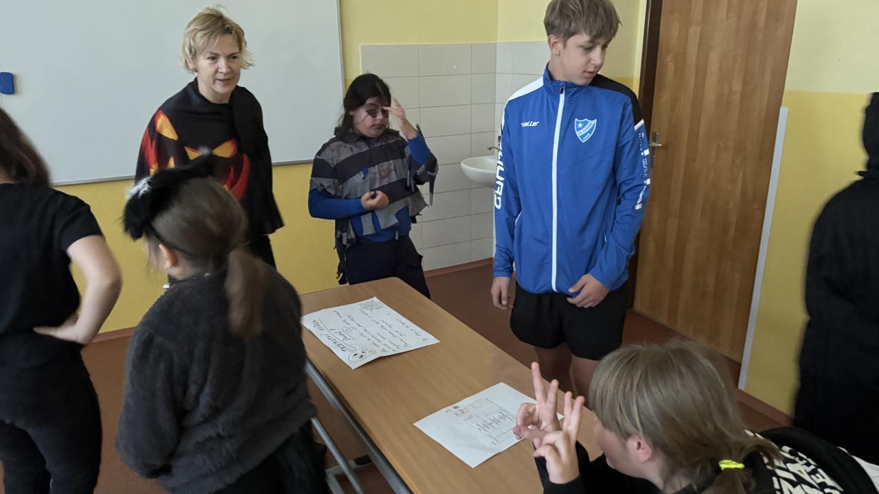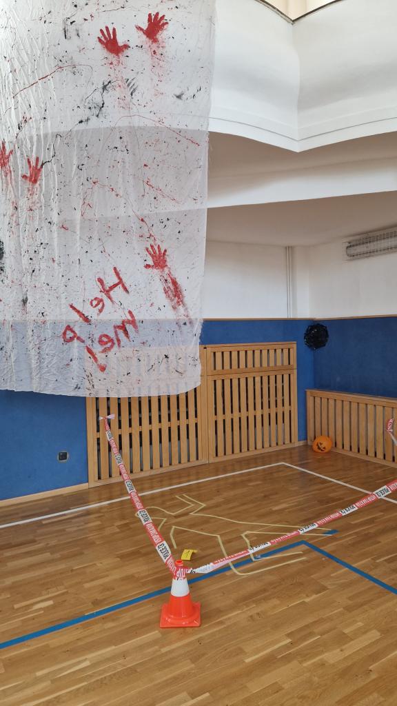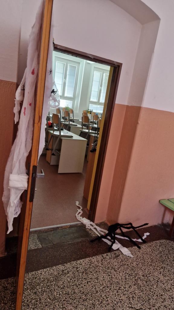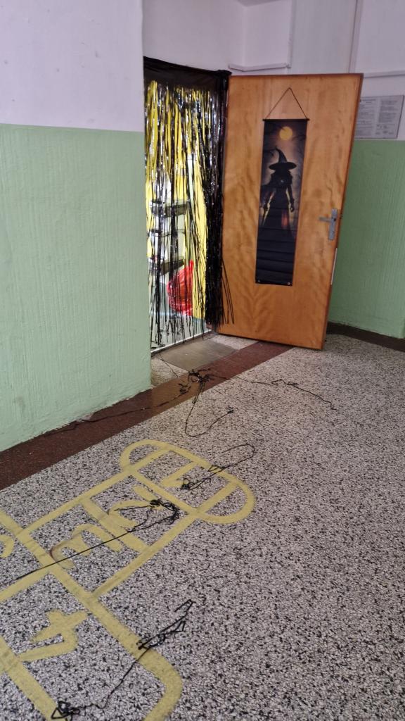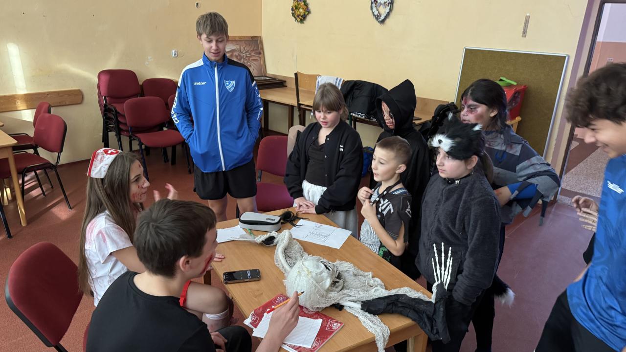 Ráno jsme se všichni sešli ve vyzdobené tělocvičně, kde nás čekala tajemná atmosféra, strašidelné dekorace a halloweenská hudba. Po rozřazení všech žáků do osmnácti týmů následoval krátký úvod do akce od pana ředitele a ode mě.