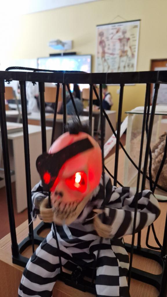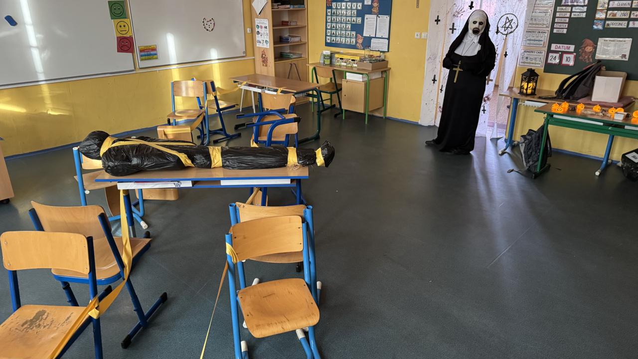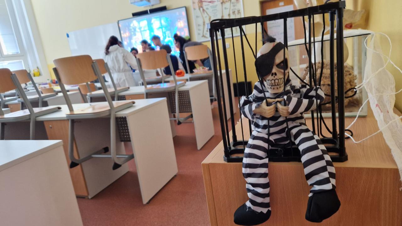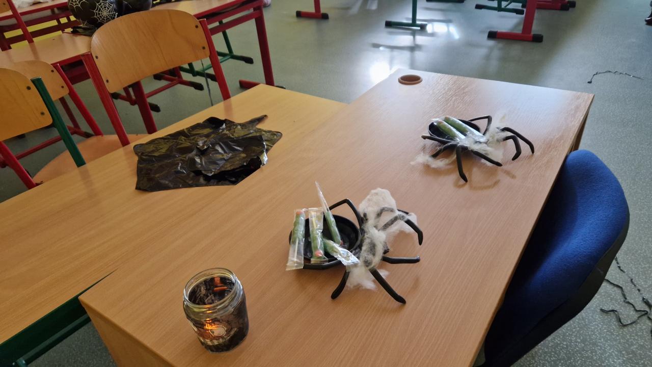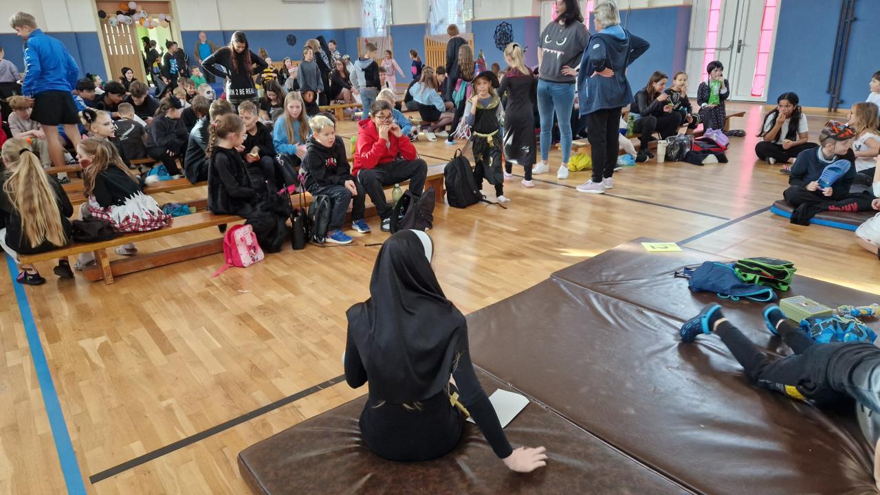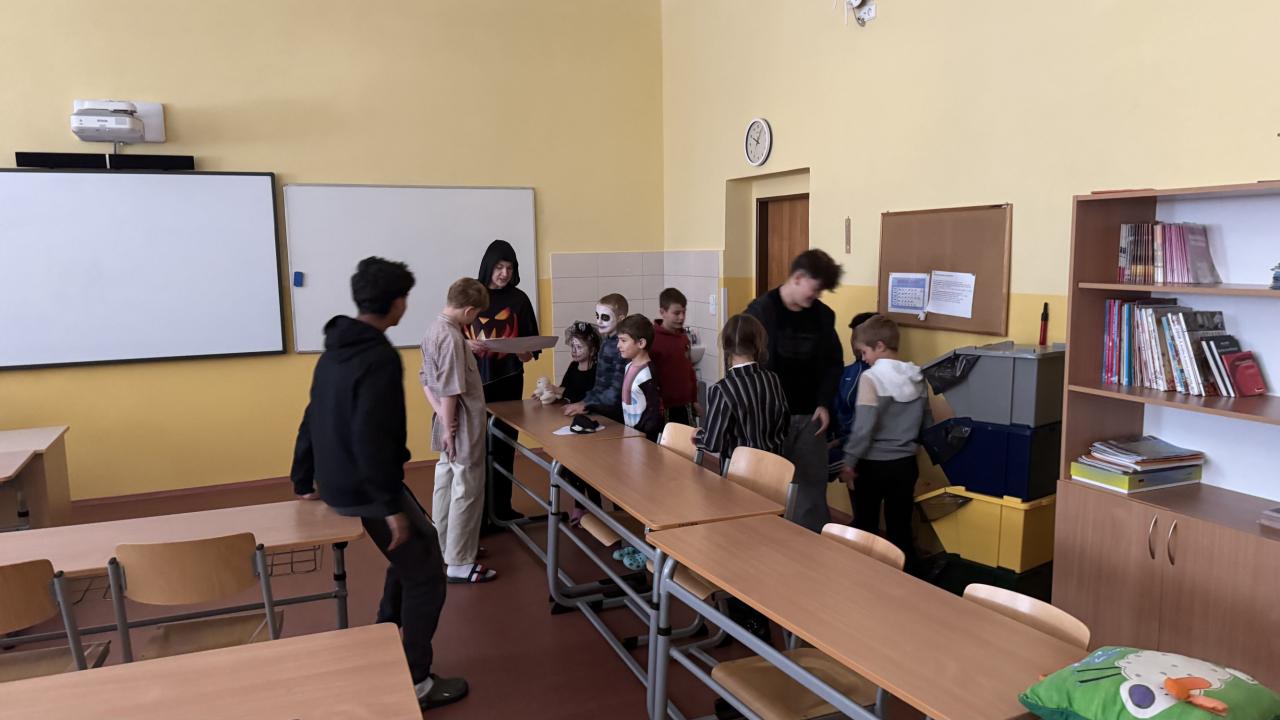Ráno jsme se všichni sešli ve vyzdobené tělocvičně, kde nás čekala tajemná atmosféra, strašidelné dekorace a halloweenská hudba. Po rozřazení všech žáků do osmnácti týmů následoval krátký úvod do akce od pana ředitele a ode mě.