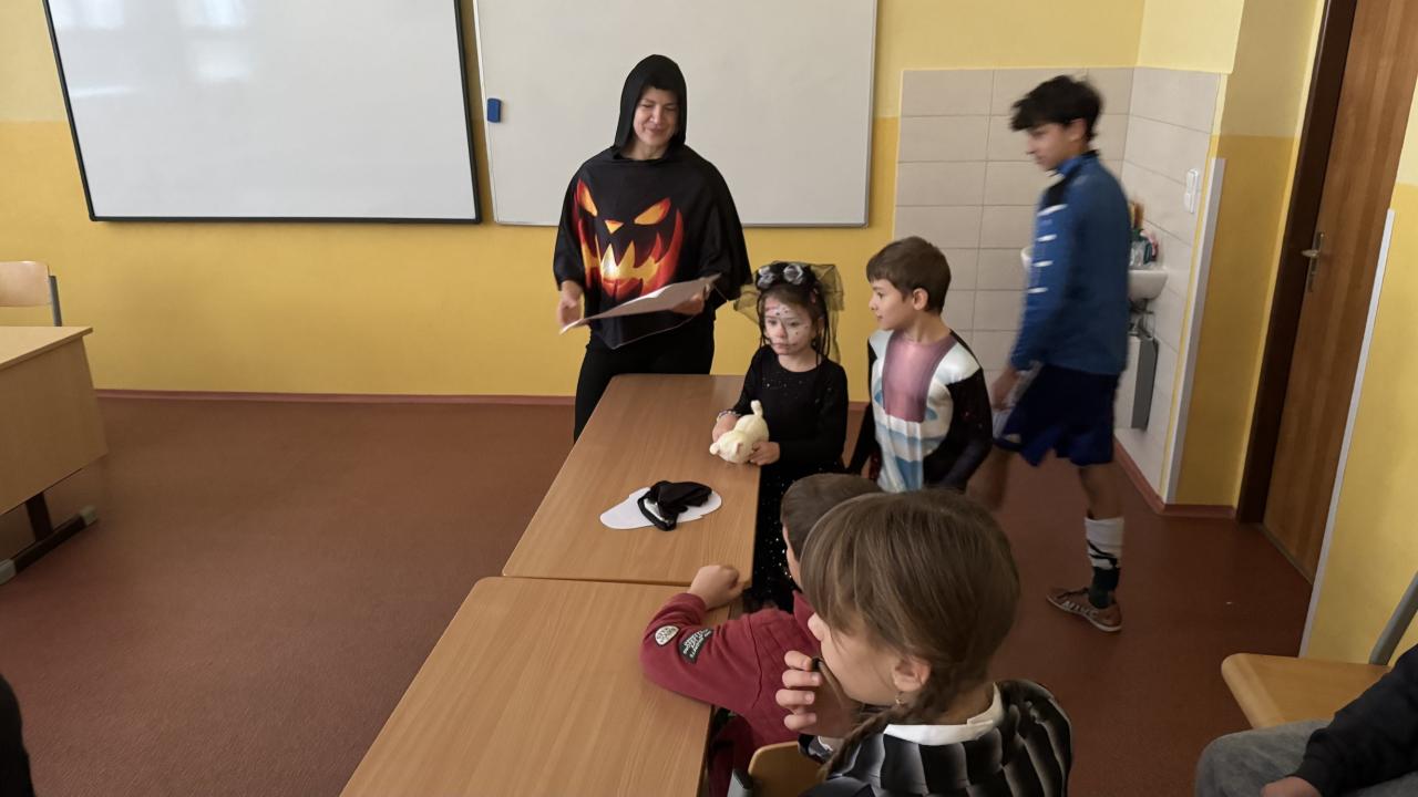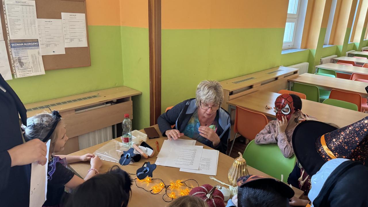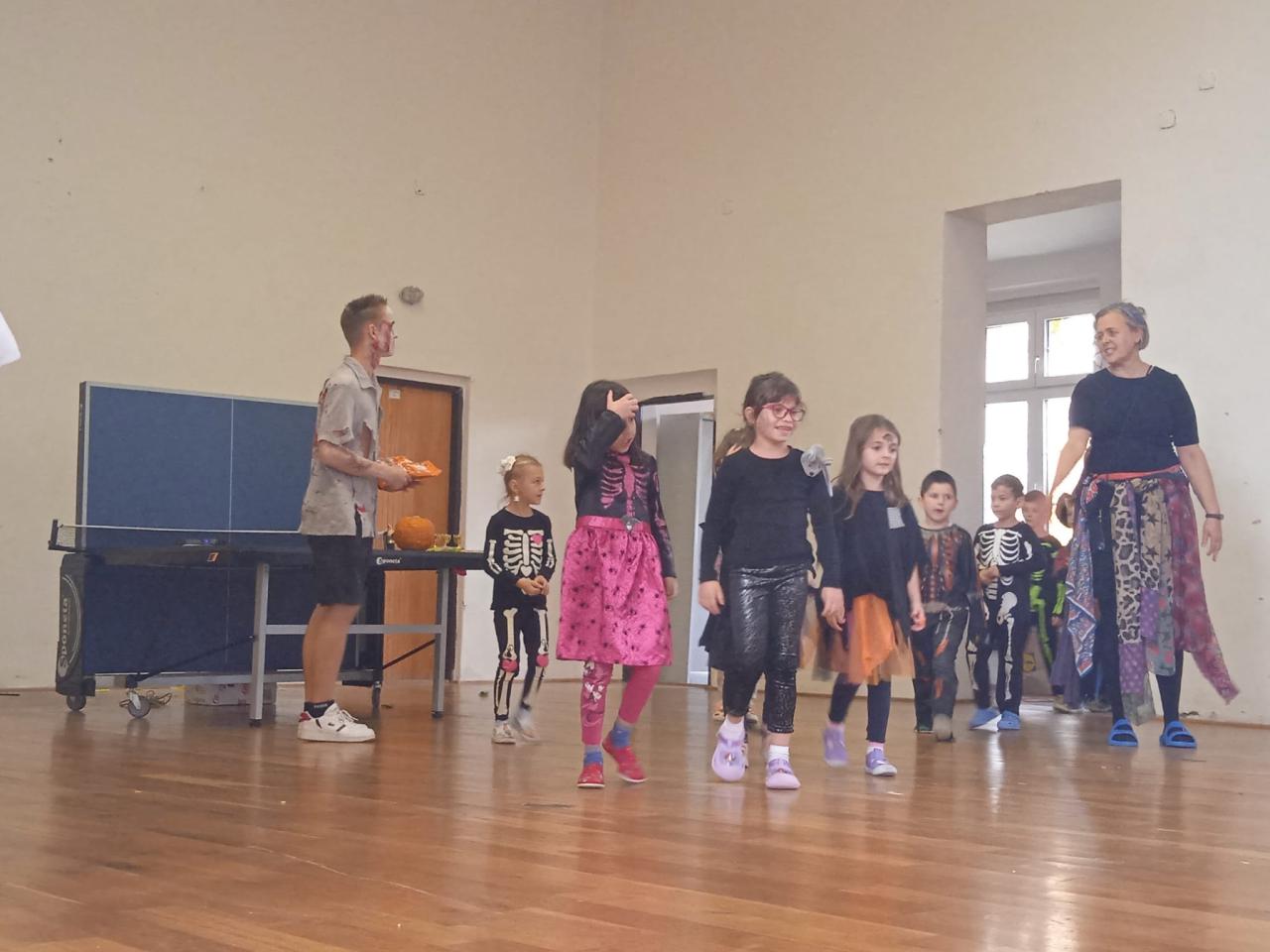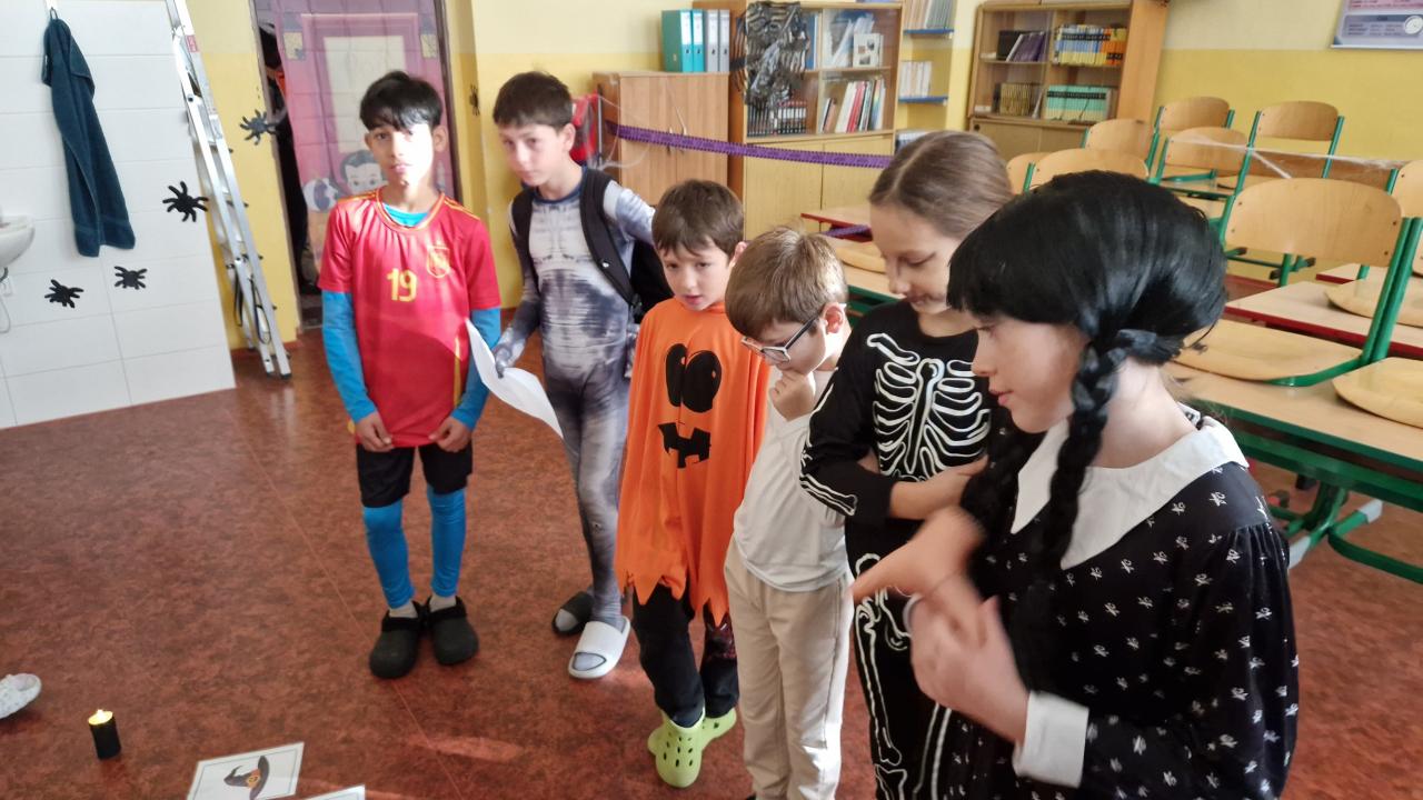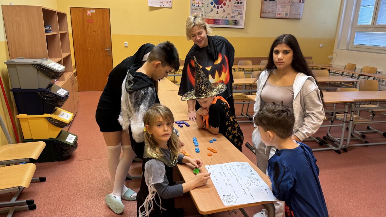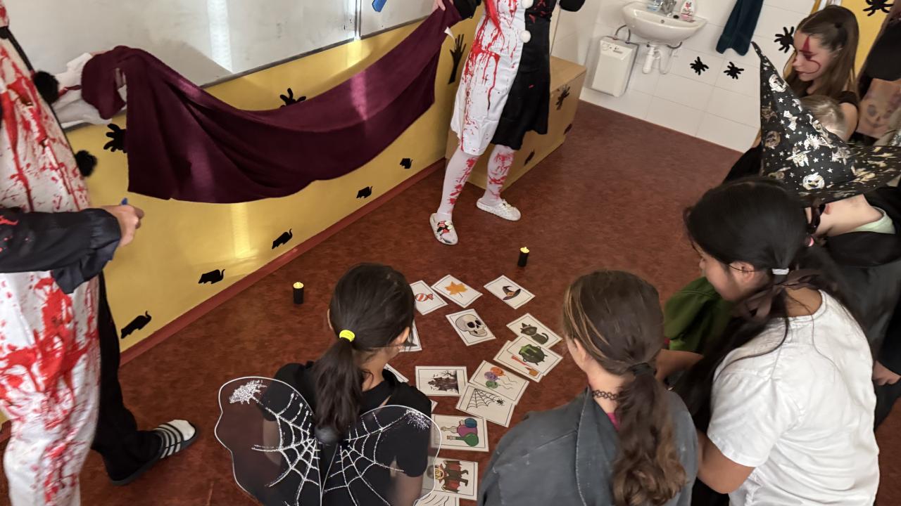 Týmy se vydaly na různá stanoviště po celé škole – od sklepa až po půdu, kde na ně čekal i duch školy, který se objevuje jen výjimečně. :) Na stanovištích plnili účastníci zábavné a někdy i napínavé úkoly – například pantomimu, hod šipkami, míchání kouzelných lektvarů nebo poznávání písní z halloweenských a strašidelných filmů.