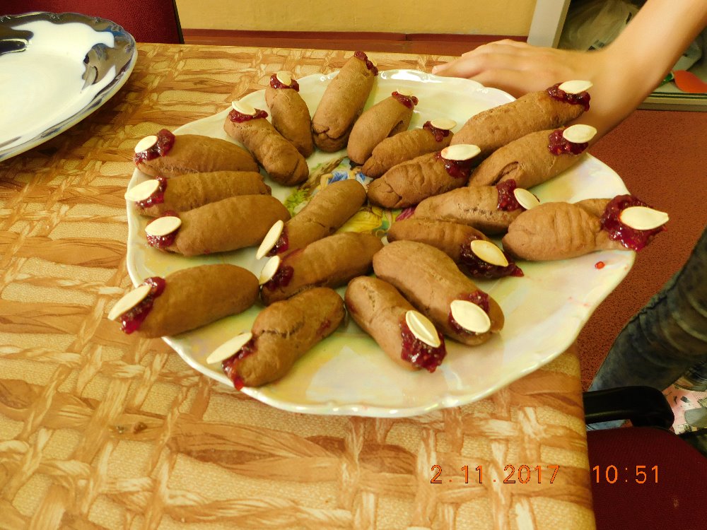2.11.2017 tentokrát ve čtvrtek, jsme šli do školní kuchyňky, kde jsme pekli a vařili. Začali jsme dýňovou polévkou a pár holek začalo dělat jakoby uříznuté prsty. Udělaly jsme si z ingrediencí těsto, které jsme pak tvarovaly do tvaru prstu a koncem lžíce jsme dělaly klouby. Poté jsme hotové prsty daly do trouby. Po vytáhnutí jsme horní část prstů potřely jahodovou marmeládou a na ní jsme daly semínko dýně, aby to připomínalo nehet „ Všichni se do prstů „ hned pustili a za jednu minutu zbylo