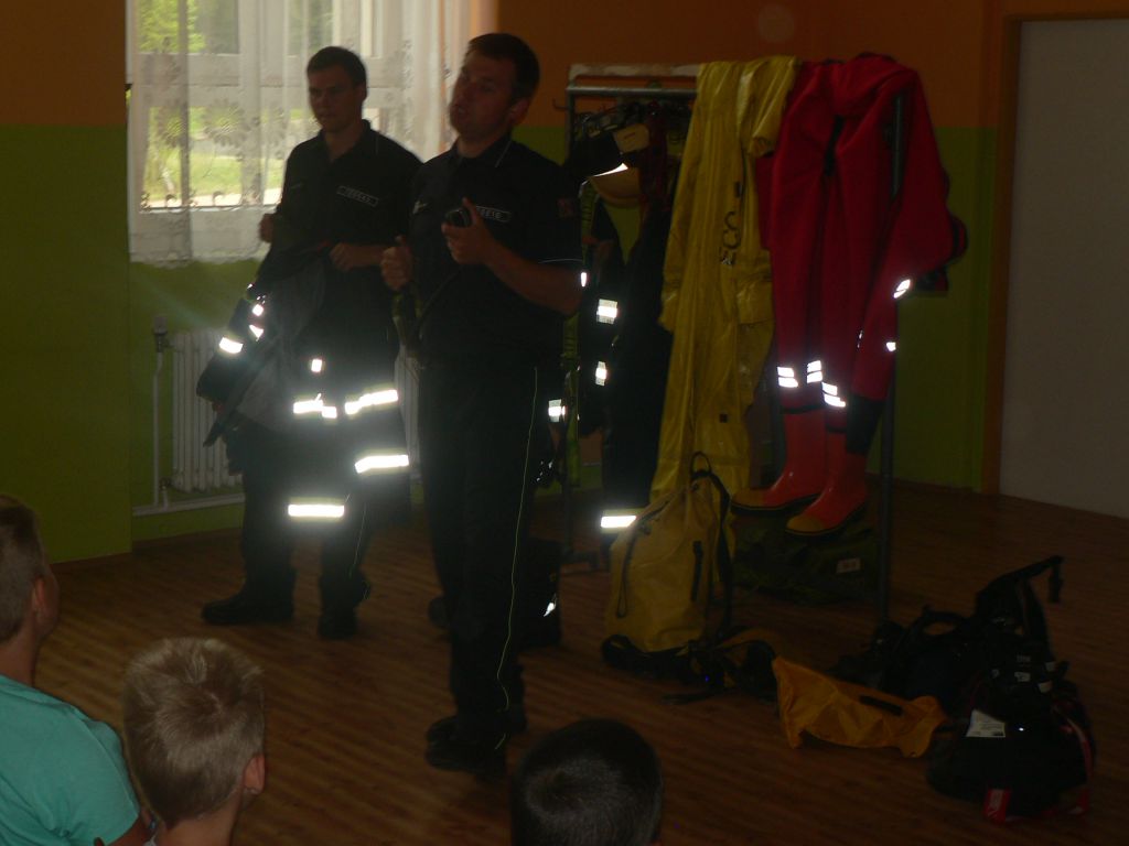 občanů při požárech a jejich prevenci, s možnými právními následky v souvislosti s požáry. V jídelně byla připravena též prezentace - tentokrát s ukázkami ze zásahů. Co asi žáky nejvíce zaujalo byly ukázky výstroje a pomůcek, které hasiči při požárech používají.
