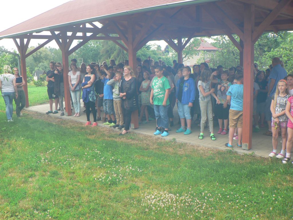 Reakce pedagogů, žáků i dalších zaměstnanců byla opravdu velmi rychlá - poslední žáci opustili budovu do 4 minut po vyhlášení poplachu. Shromáždili se pod přístřeškem a pozorovali, co se bude dít. Současně se rozeznívá siréna místních hasičů. A kdo by pochyboval o důležitosti cvičení, když byly evakuovány od svých ploten i naše paní kuchařky a ze svých pracovišť i ostatní personál školy?