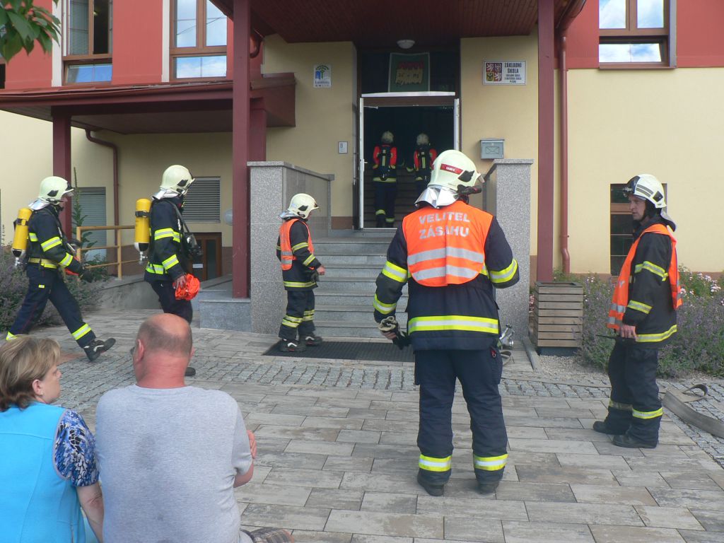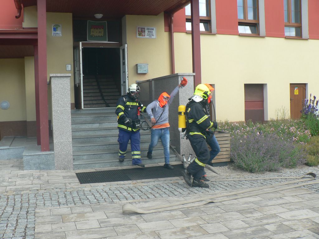 Místní hasiči dorazili na místo "požáru" jako první, zjišťují informace, monitorují situaci, rozvíjí hadice a začíná evakuace prvních deváťáků. Zvuky sirény přilákaly diváky - i děti z MŠ se přišly na zasahující hasiče podívat.