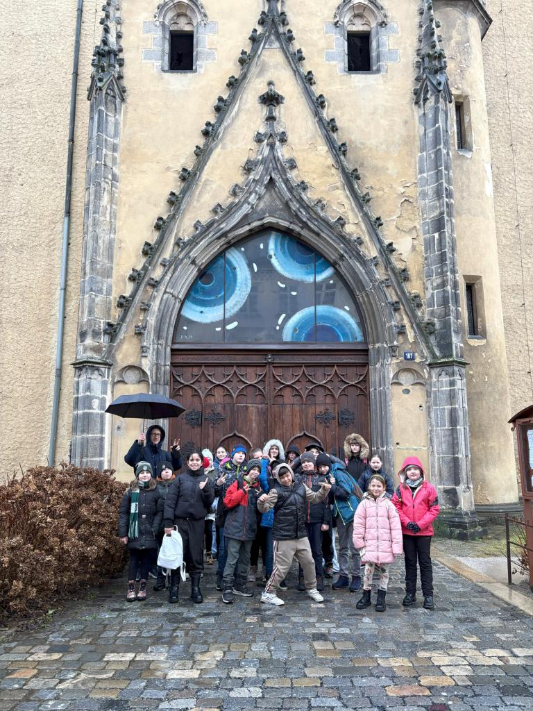 Naše první kroky vedly do krásného kostela sv. Mikuláše a sv. Alžběty v Chebu, kde nás mile přivítala průvodkyně, která nás provedla celým areálem. Nejenže jsme se mohli pokochat majestátní výzdobou kostela, ale nahlédli jsme také do podsklepení, které ukrývá mnoho zajímavých tajemství z minulosti. Dále jsme navštívili faru, kde žije farář, a prohlídka vyvrcholila výstupem do kostelních věží. Po zdolání mnoha schodů se nám naskytl úžasný výhled do okolí. Prohlídka kostela byla nezapomenutelným zážitkem, který nám přiblížil nejen architekturu, ale i život v minulých dobách.
