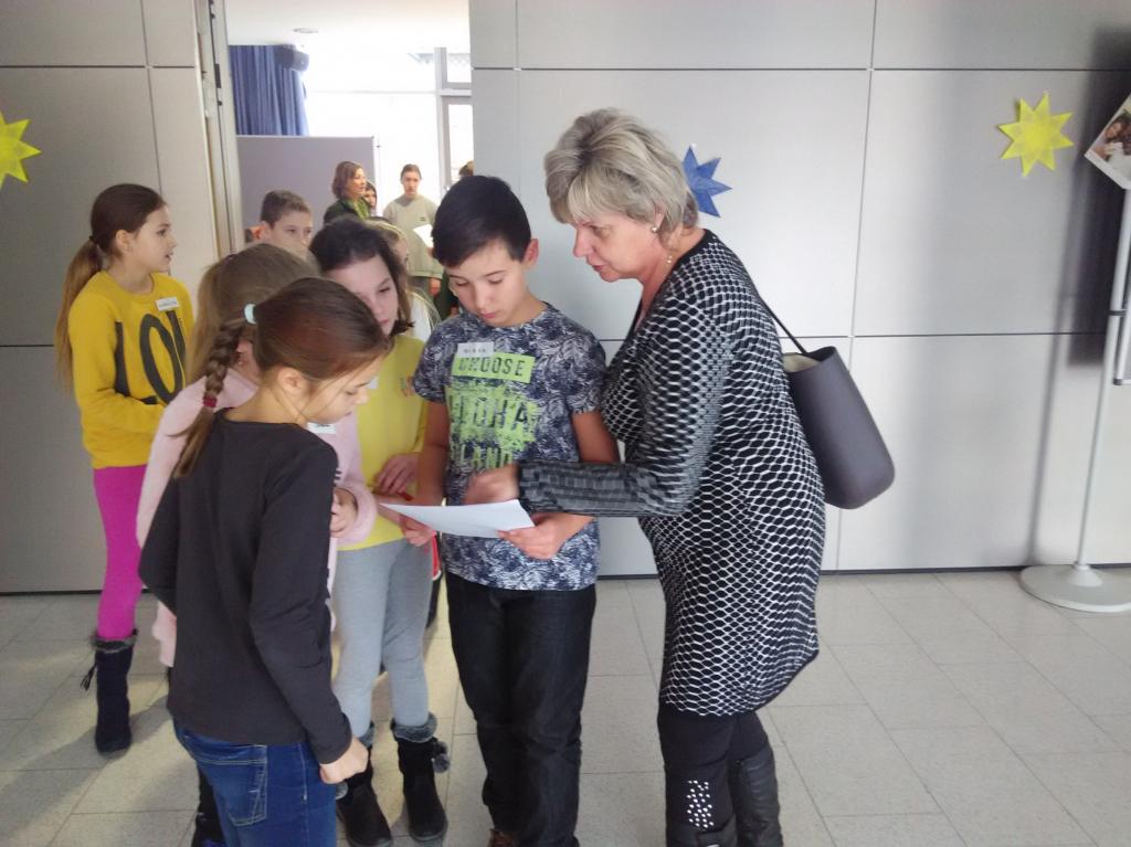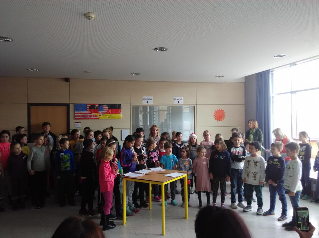 Na závěr jsme se všichni přesunuli zpět do auly, kde už čekalo pár rodičů, aby si poslechli povídání dětí o vánočních zvycích v Čechách a v Německu. Celý program byl zakončen společným zpíváním čtyř koled. Německé děti zvládly dokonce s těmi našimi česky zazpívat Rolničky.