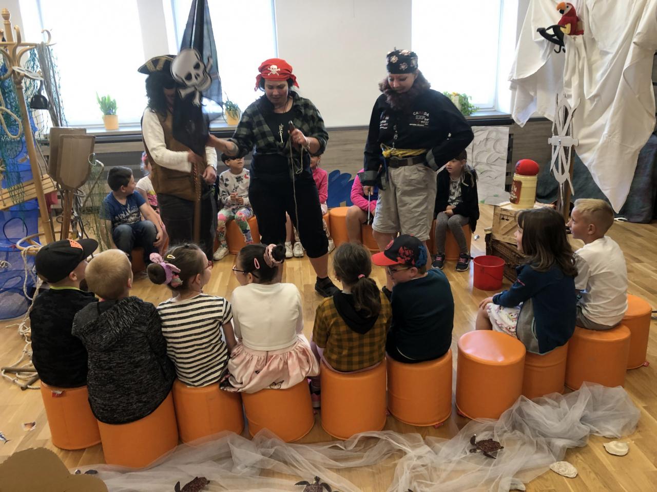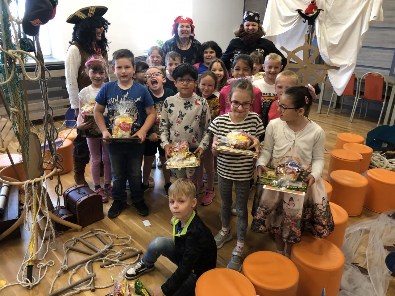 Po příchodu do sálu MKS jsme se stali součástí posádky pirátské lodi pod velením tří pirátů, kteří hledali poklad. Naše třída jim pomáhala nejprve v obsluze lodi, veslování a přípravě pokrmu. Poté četla návod k hledání pokladu. Piráti totiž neuměli číst, tak jim prvňáci museli pomáhat. Poklad se podařilo po delším hledání nalézt v několika truhlách. V menších byly zlaté mince a šperky, ale v té veliké byl poklad pro čtenáře. Než ho dostali, museli být pasováni kapitánem lodi na čtenáře a získali krásnou knihu, průkazku do místní knihovny a drobné sladkosti. Nakonec se celé posádka na památku vyfotila. Moc děkujeme za krásně připravenou akci.