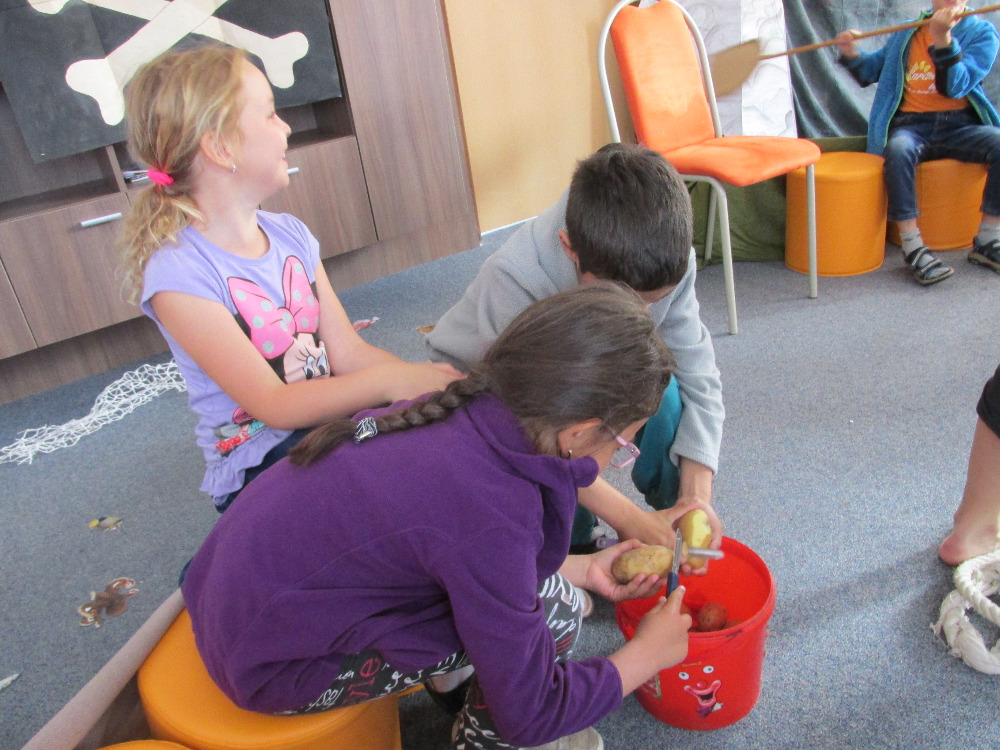 12. 6. 2017 navštívila naše třída velmi zajímavou akci v naší místní knihovně. Hned po příchodu do klubu MKS jsme byli překvapeni přeměnou celého prostoru na pirátský škuner a stali se účastníky výjimečného představení. Na palubu vtrhli tři piráti a okamžitě celou posádku zaměstnali prací (škrabání brambor, drhnutí paluby, pádlování, kormidlování). Museli jsme jim pomoci najít vytoužený poklad, který byl napsaný na kartičkách, ale piráti neuměli číst. Prvňáci jim v tom pomohli, všechno přečetli a pořádný poklad byl nalezen.
