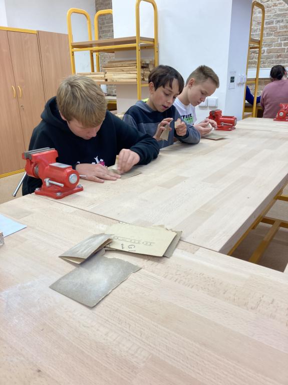ze dřeva. Museli do hladka opracovat všechny hrany. Škoda bylo, že v krátkém čase nestihli kostku dokončit. Někteří si z kostky udělali přívěšek.