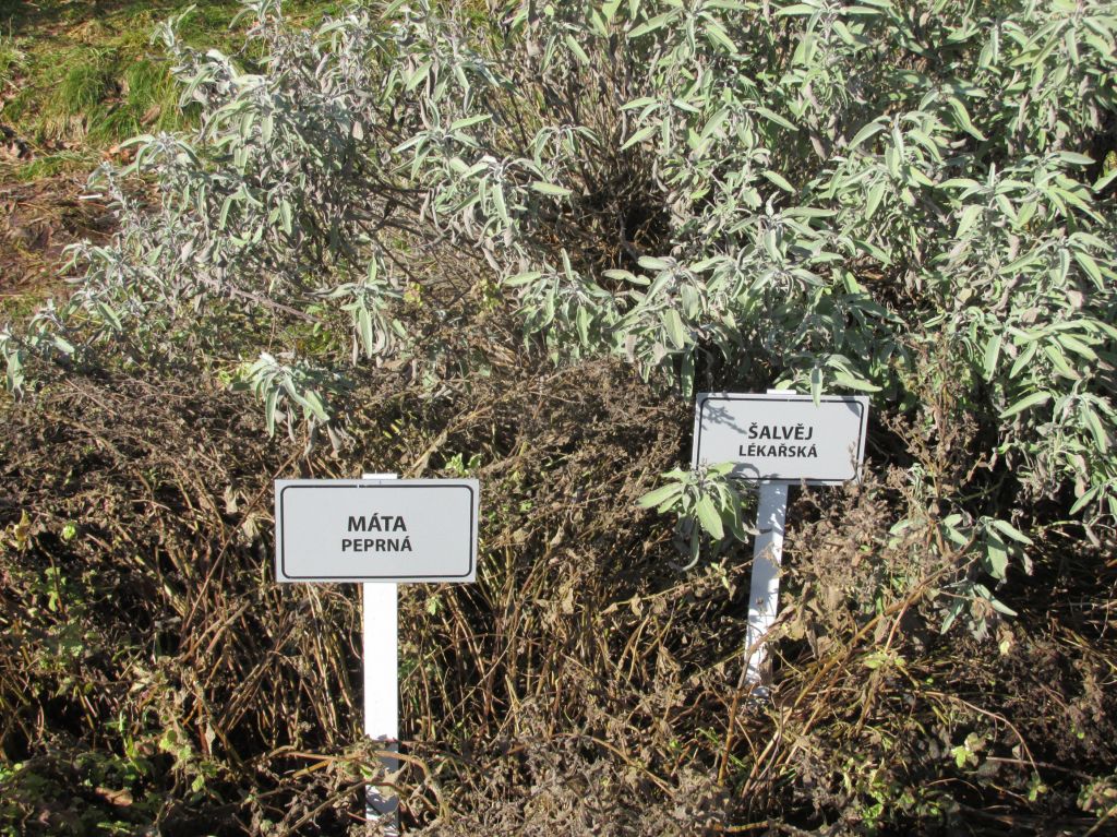 1) Zápichy s tabulkami označujícími jednotlivé druhy rostlin - dřevin i bylin. Přece jen jich v zahradě máme tolik, že popisky s názvy přímo u nich jsou rozhodně lepším řešením než plánek.