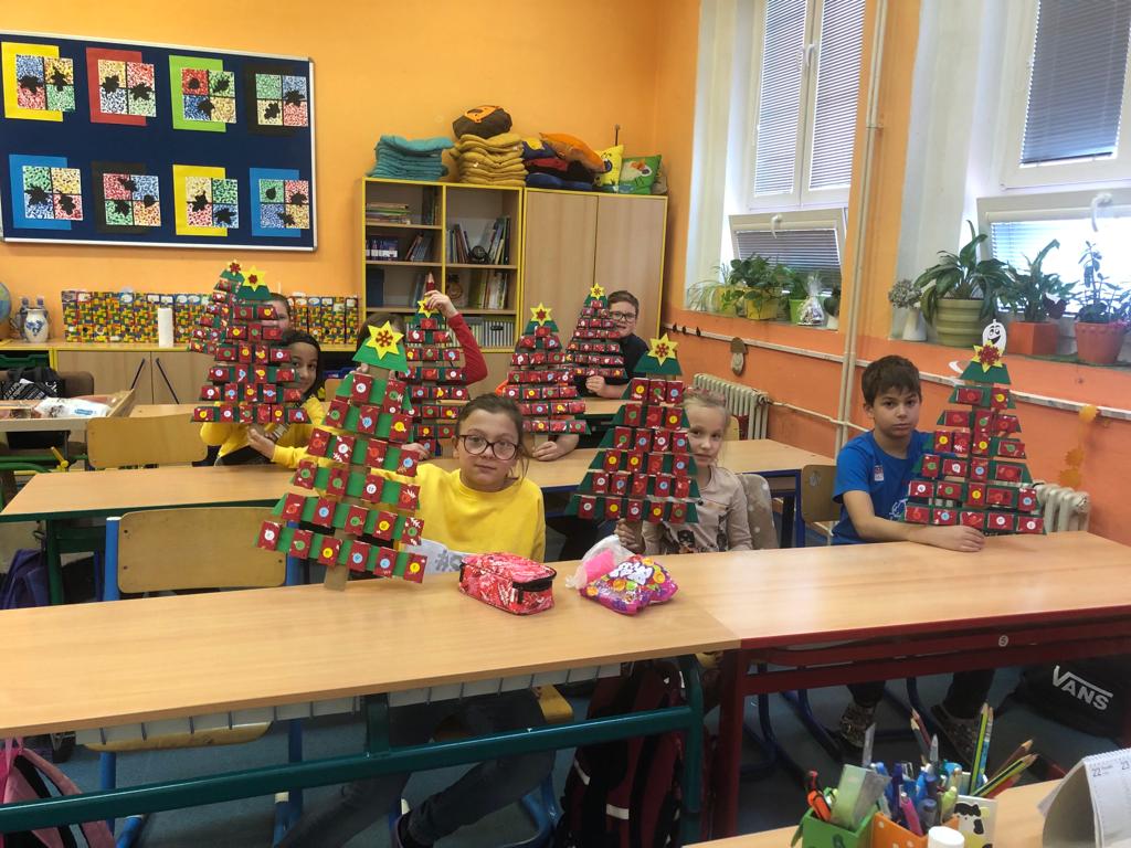 Při hodinách pracovních činností jsme si z krabiček a kartonu vyrobili adventní kalendáře ve tvaru stromečku.