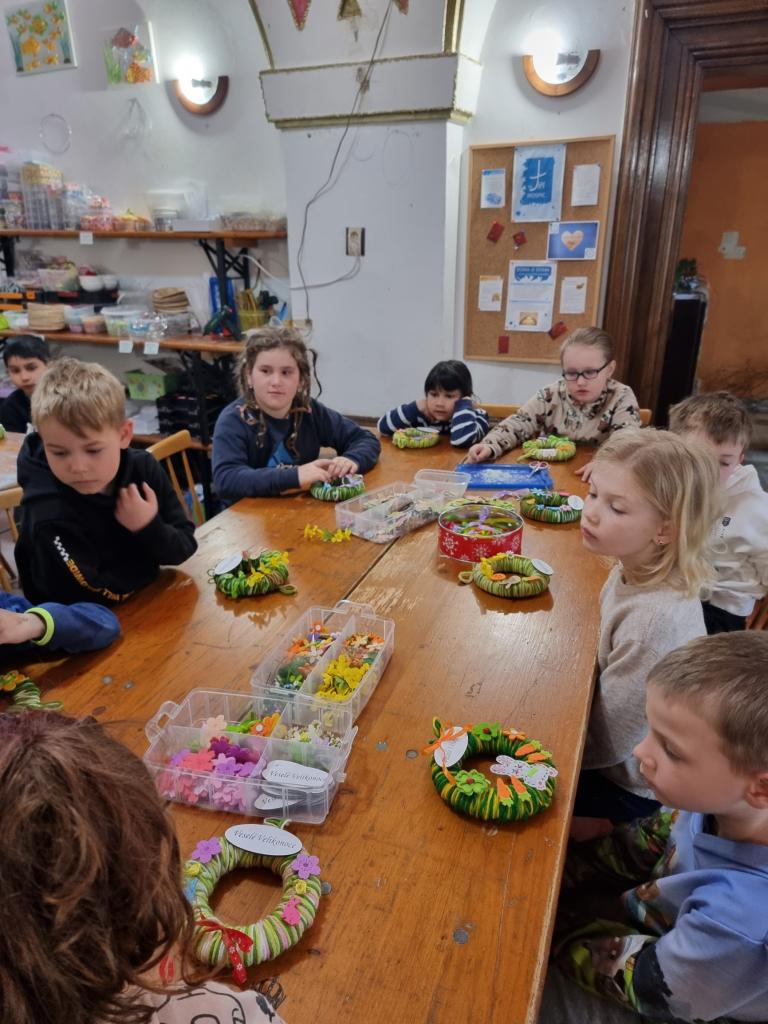 Společně podle pokynů každý žáček vyráběl jarní věnec na dveře. Děti pracovaly s vlnou, lepily si na věnec dekorace , které byly na výběr v různém barevném provedení a v nejrůznějších motivech.