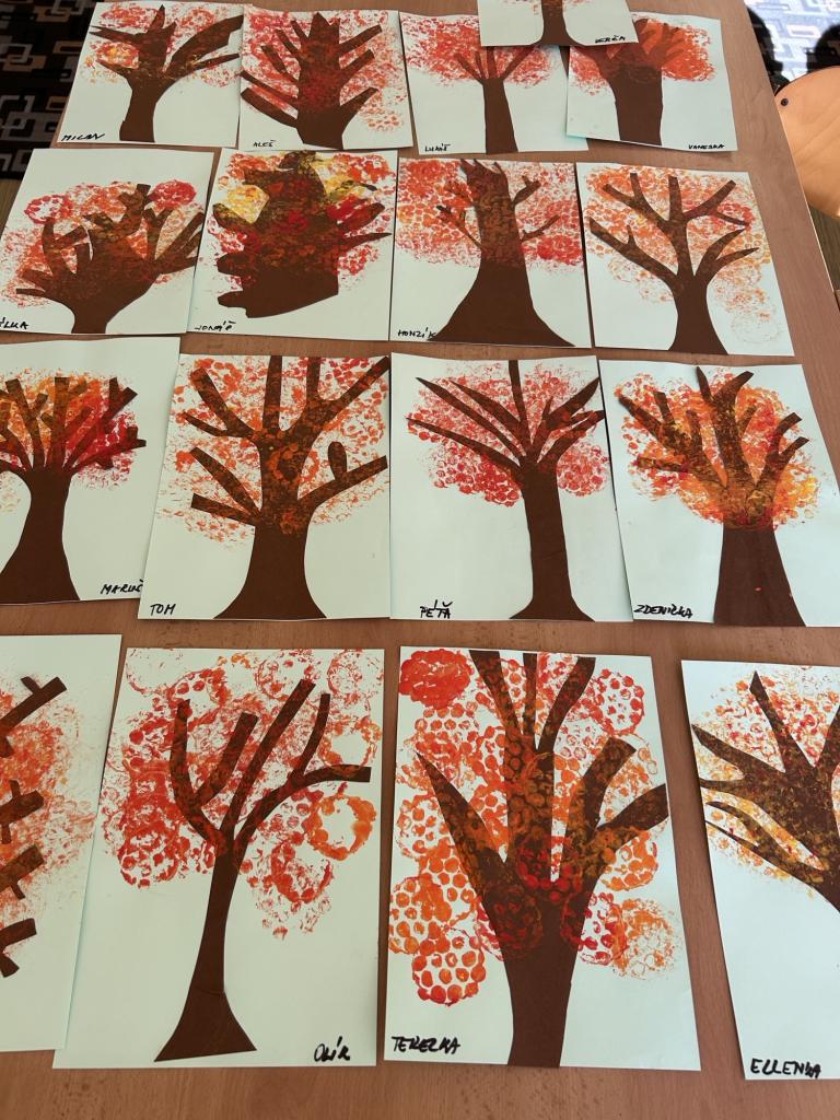 Často jsme vyráželi na školní hřiště, kde jsme si užívali čerstvý vzduch a krásně vybarvenou přírodu kolem nás. Děti měly možnost kreslit mnoho podzimních obrázků – stromy s barevným listím a další podzimní motivy, které přinesly do naší družiny veselou atmosféru.