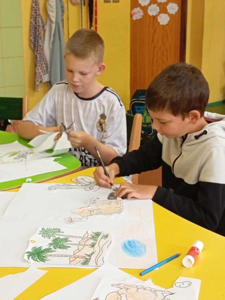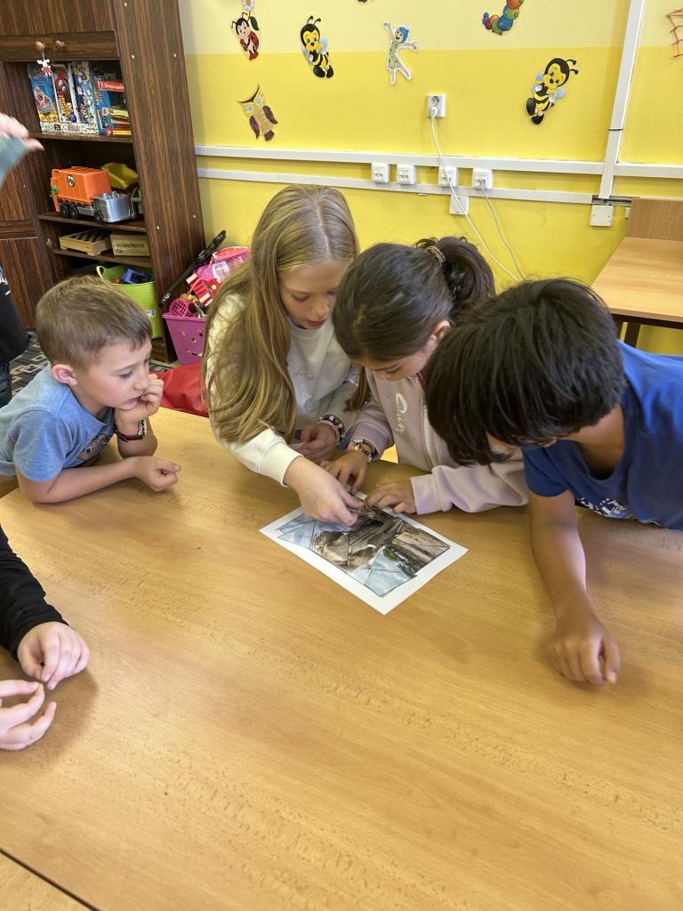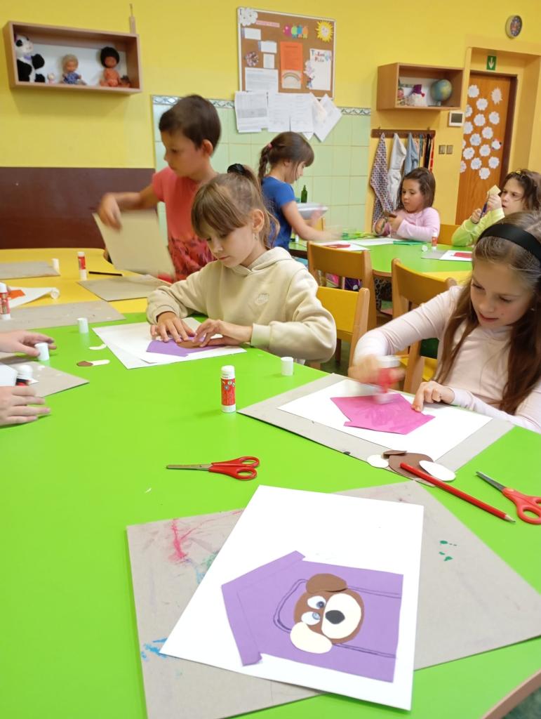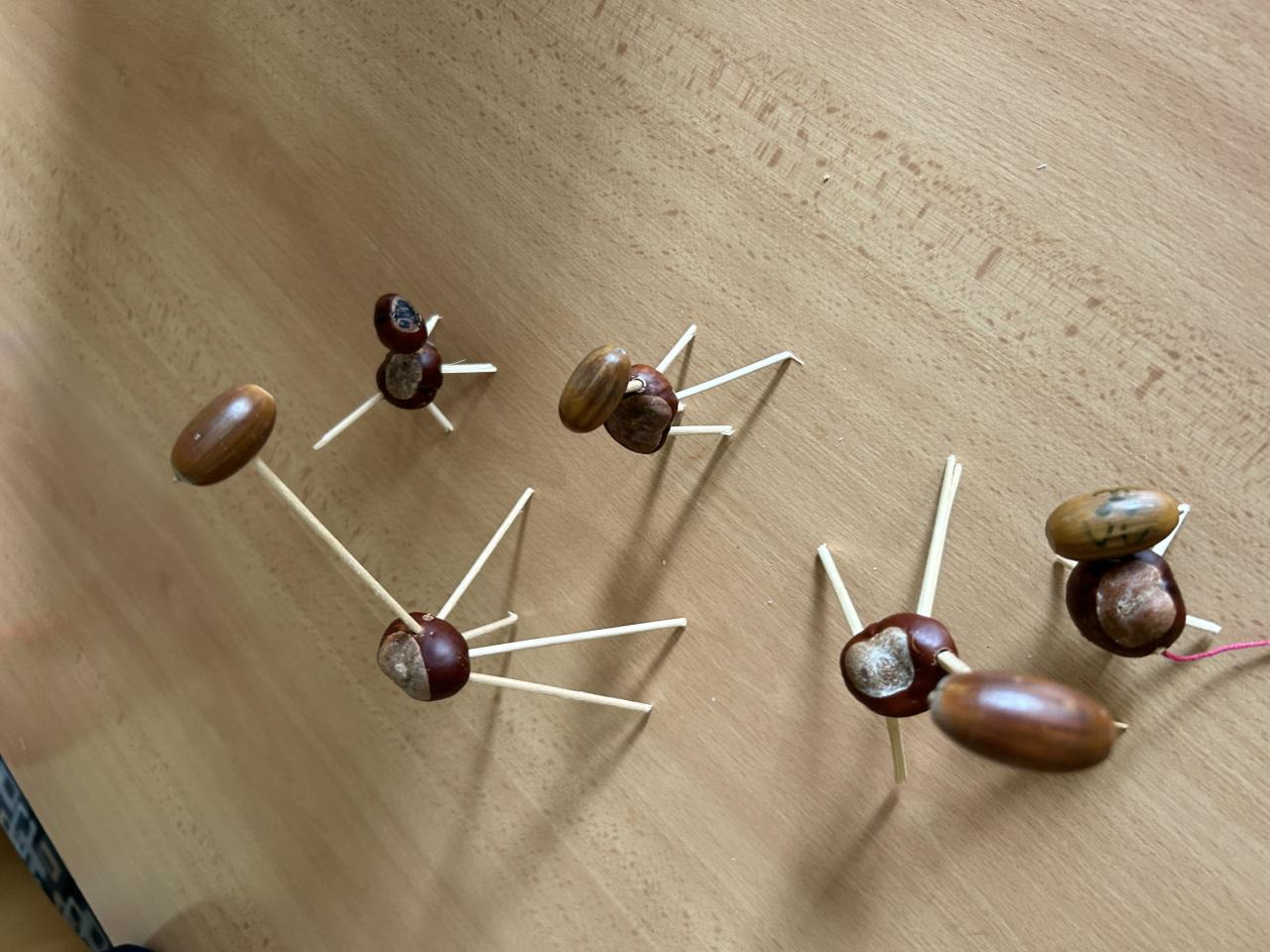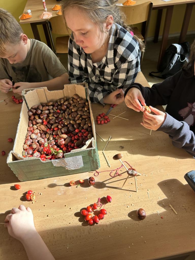 Využívali jsme hezkého počasí a často chodili ven – na hřiště i na procházky. Sbírali jsme kaštany, ze kterých jsme pak ve družině vyráběli veselá zvířátka. Společně jsme si povídali o slonech, jiných zvířatech, hráli různé hry a kreslili podzimní obrázky plné barevných listů.