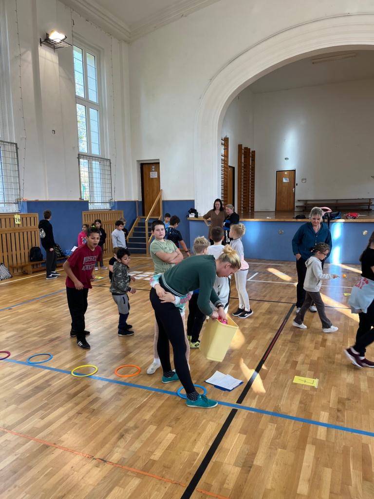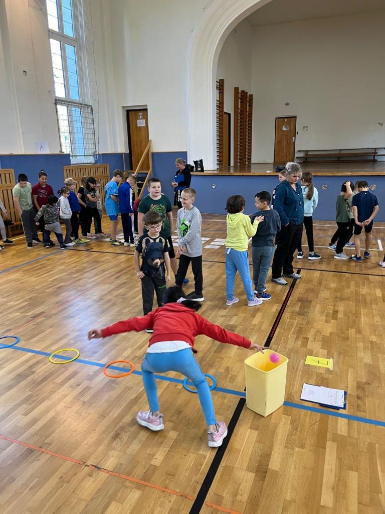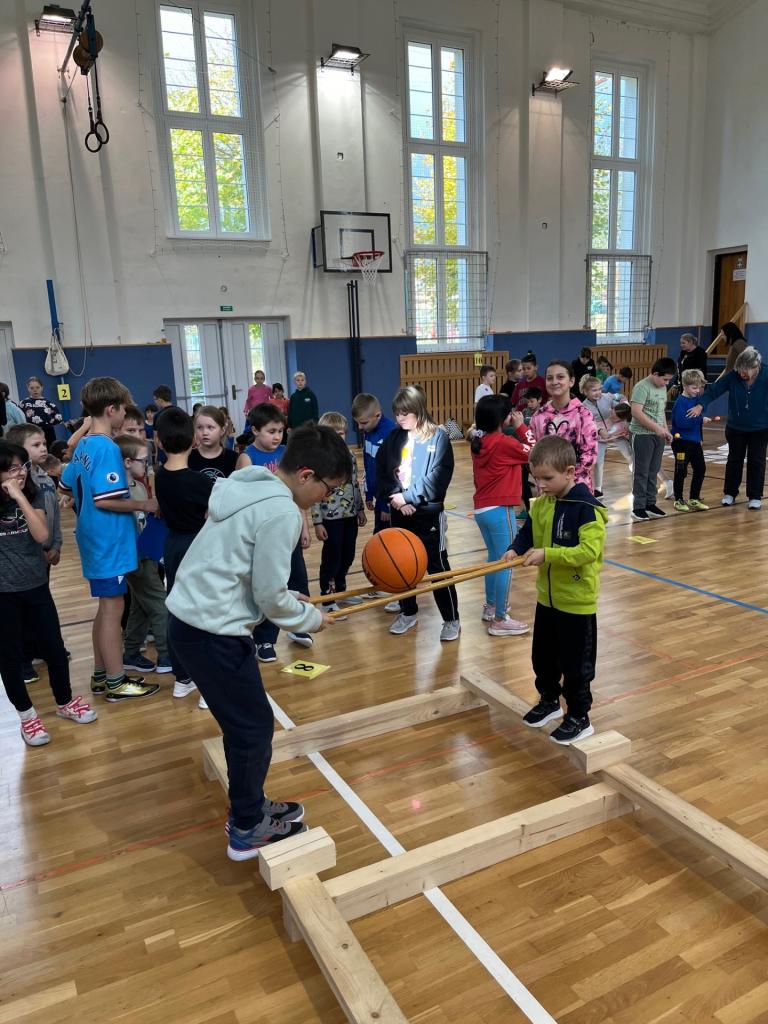 V tělocvičně už na všechny čekala připravená stanoviště s různými sportovními disciplínami (např. skákání panáka sestaveného z obručí, posouvání papírového pavouka foukáním přes brčko, twister, skákání podle geometrických tvarů nalepených na zemi, postupné sbírání balónků do koše, trefování tužky přivázané provázkem kolem pasu do hrdla lahve, atd.). Všech deset stanovišť si každé družstvo společně prošlo a splnilo. Žáci si navzájem pomáhali a povzbuzovali se.