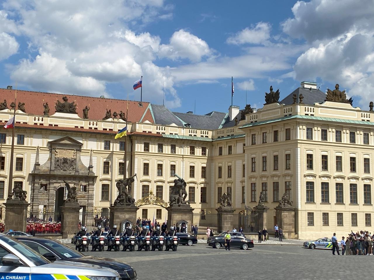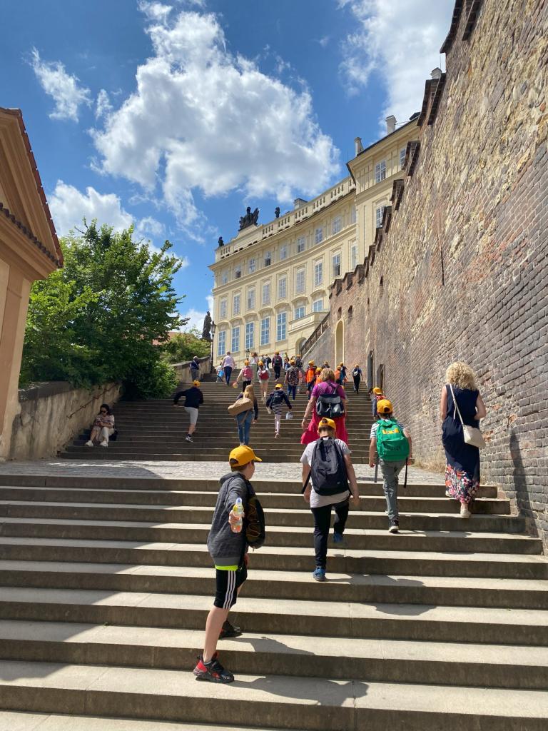 Výzvy, která nás čekala po obědě v podobě 225 schodů na Pražský hrad, se děti nezalekly a s vervou se pustily do výstupu. Odměnou byl nádherný výhled na Prahu a její budovy. Na pražském hradě nás čekalo nečekané a vzrušující překvapení. Podařilo se nám totiž spatřit pana prezidenta Petra Pavla a jeho ženu, kteří právě na hradě přivítali paní prezidentku Zuzanu Čaputovou. Tento okamžik byl pro děti nezapomenutelný. Měli možnost vidět významné osobnosti zblízka. Nadšení bylo velké a tento zážitek se pro ně stal vrcholem celého výletu.