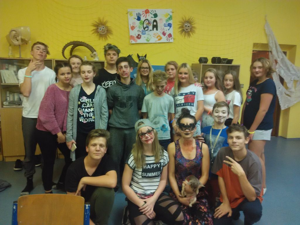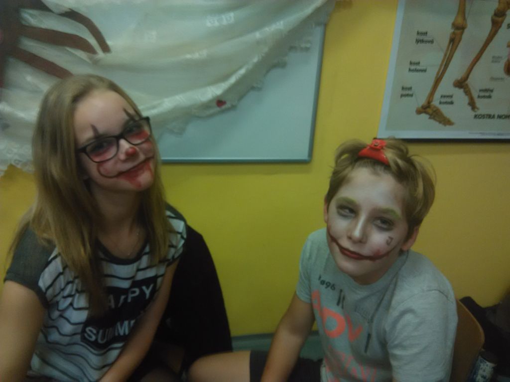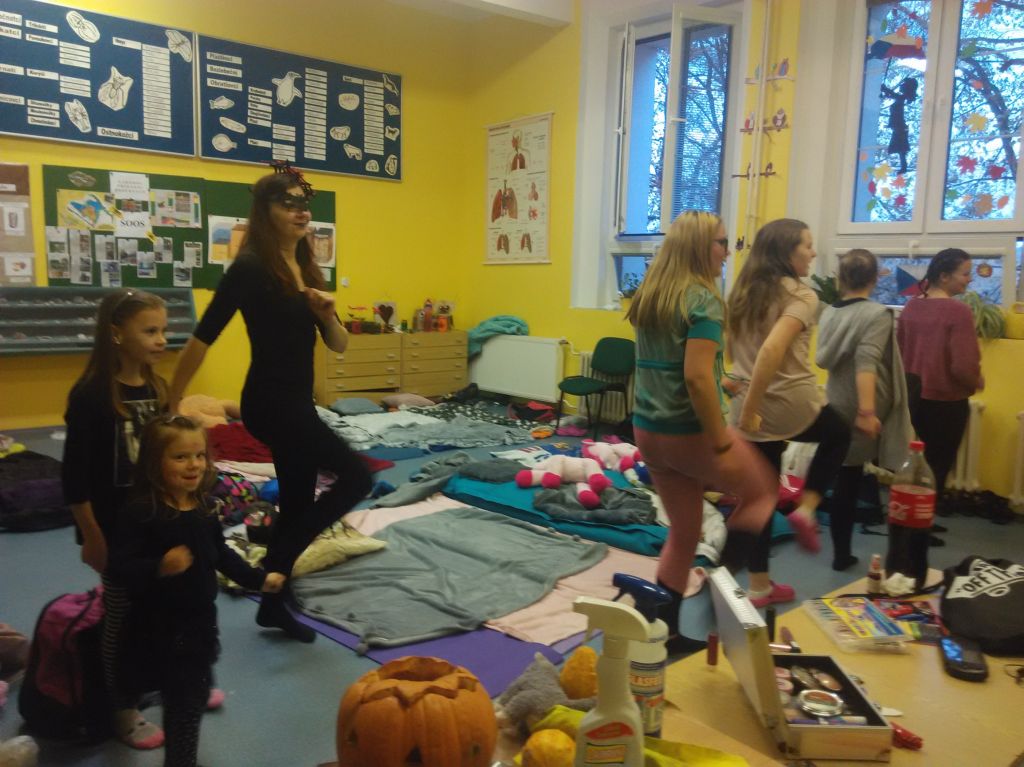 Kluci si šli kopat na „umělku“, dívky zůstaly ve třídě a tancovaly Just dance. Pro zájemce byla připravená Katka V. z 9. A, která dorazila, aby pomohla svým kamarádům namalovat obličeje. Někteří si halloweenské masky na svém obličeji vytvořit nechali, jiní se obešli bez nich. Po setmění jsme se přesunuli do tělocvičny, kde si chlapci dohromady s dívkami zahráli florbal. Po cca půl hodině jsme uklidili branky a hokejky, neboť přijela paní učitelka Jandová, která všem přivezla pizzu z místní pizzerie. Když se děti navečeřely, trochu se navzájem postrašily. Následně někteří ulehli a koukali se na horrory, ostatní hráli flašku na chodbě. O půlnoci jsme děti zahnaly do hajan, ovšem ty usnuly až tak mezi druhou a třetí hodinou.