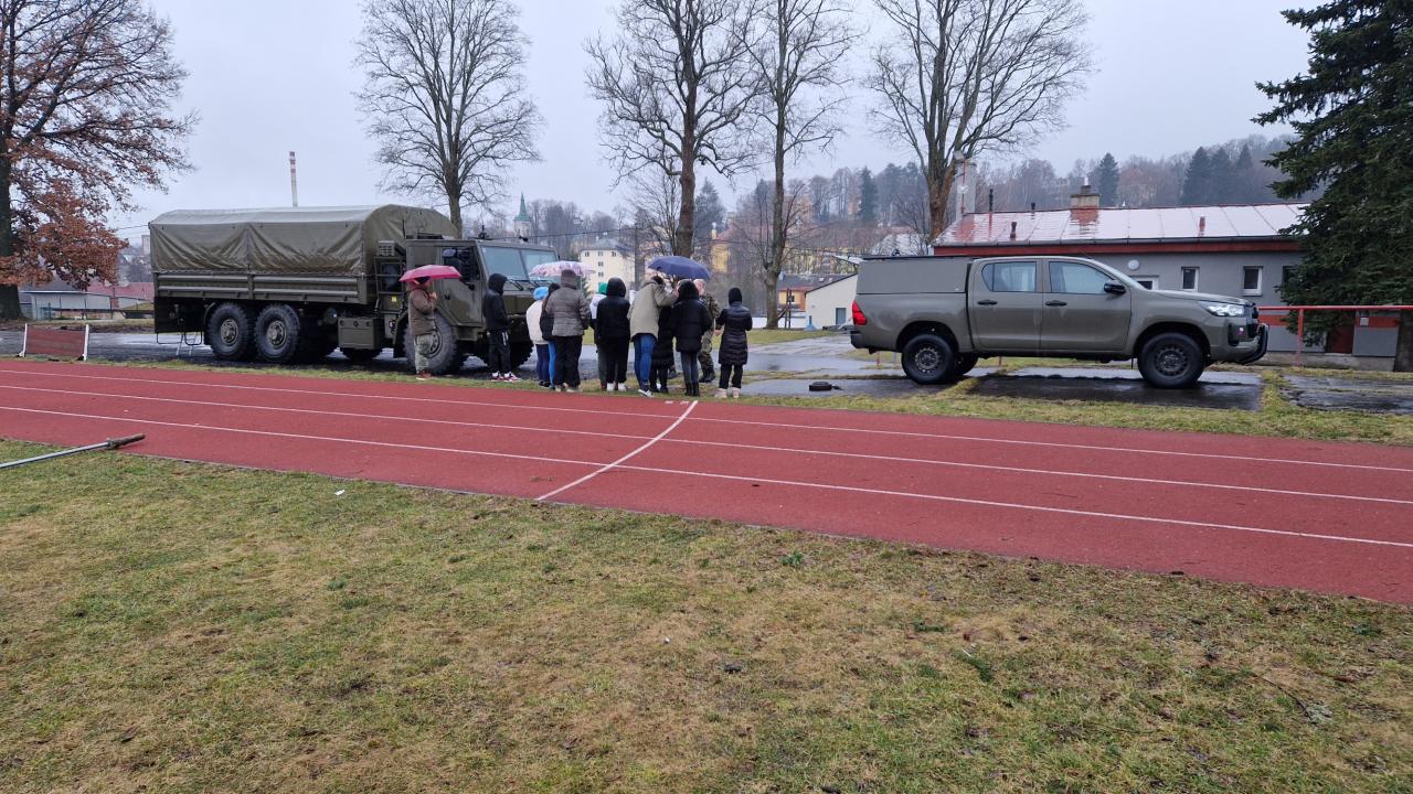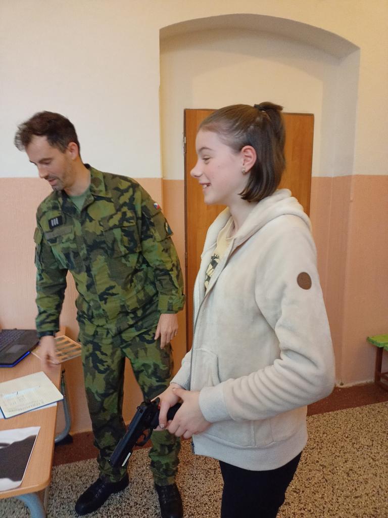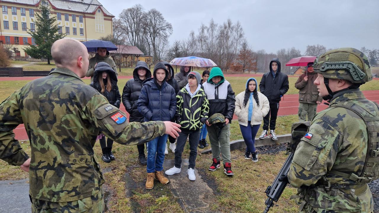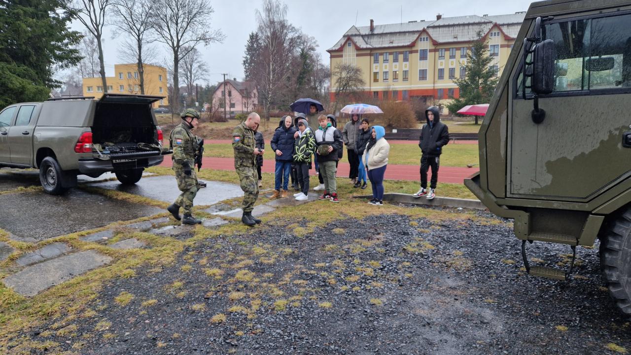 Dne 9. 2. 2024 měli žáci 2. stupně jedinečnou příležitost poznat armádu a vojenskou techniku přímo na vlastní kůži. Krajské vojenské velitelství Karlovy Vary přijelo přímo na naši školu a připravilo pro žáky čtyři stanoviště, z nichž jedno bylo věnováno vojenské technice.