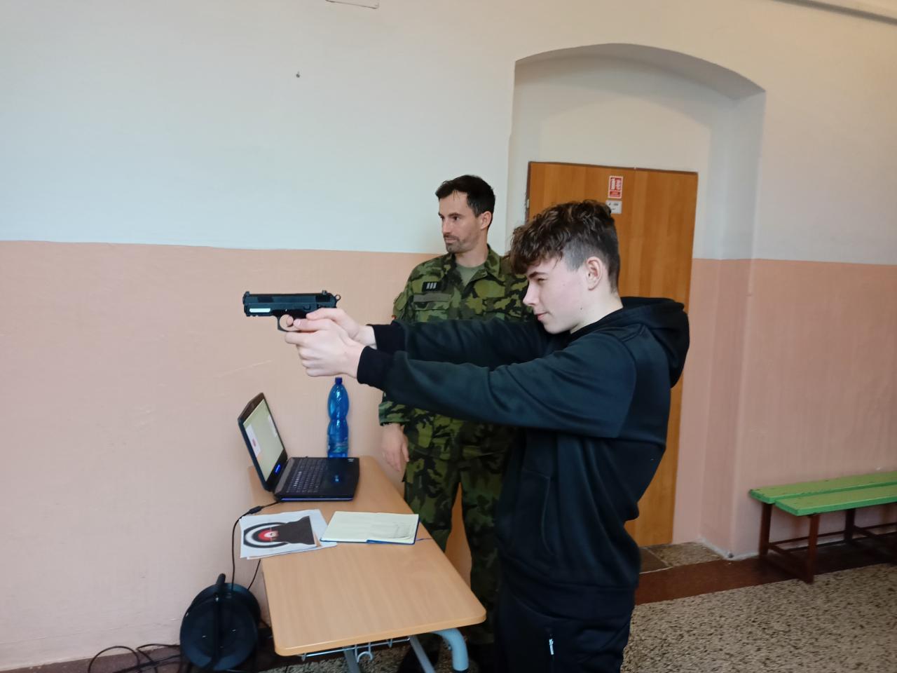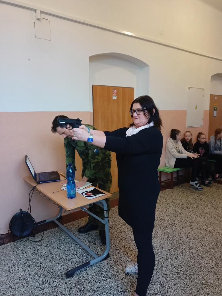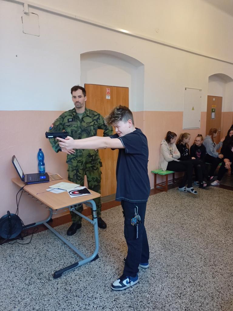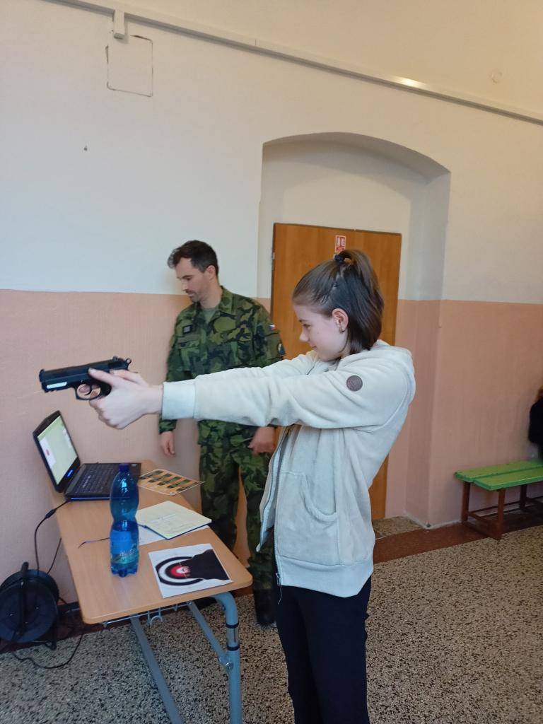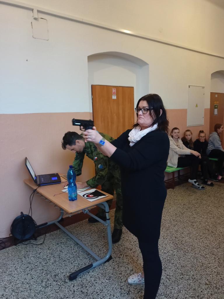 2) Jedním ze stanovišť byla také střelba. Žáci si zde vyzkoušeli úchop zbraně, postoj, míření a samozřejmě i střelbu na cíl. Zbraň byla laserová a terč snímal výsledky, které nám vyhodnotil počítač. Ve výsledcích se, dle slov vojáka, odrazily hodiny hraní počítačových “stříleček” a někteří žáci nás překvapili s téměř maximálním počtem bodů. Zahanbit se nenechali ani někteří učitelé a také si střelbu vyzkoušeli.