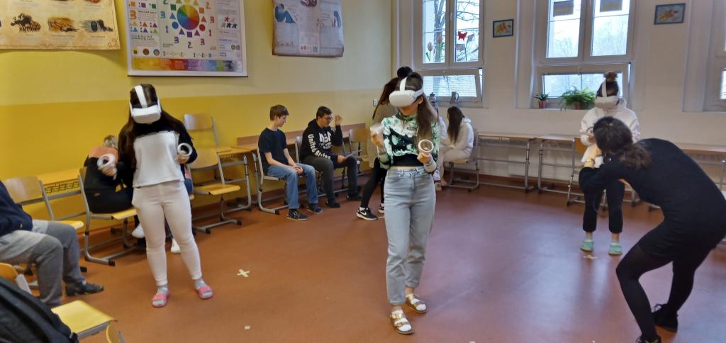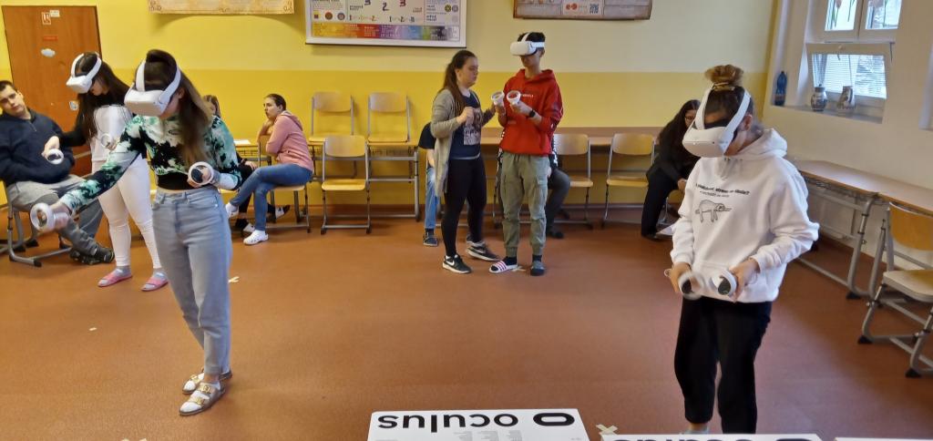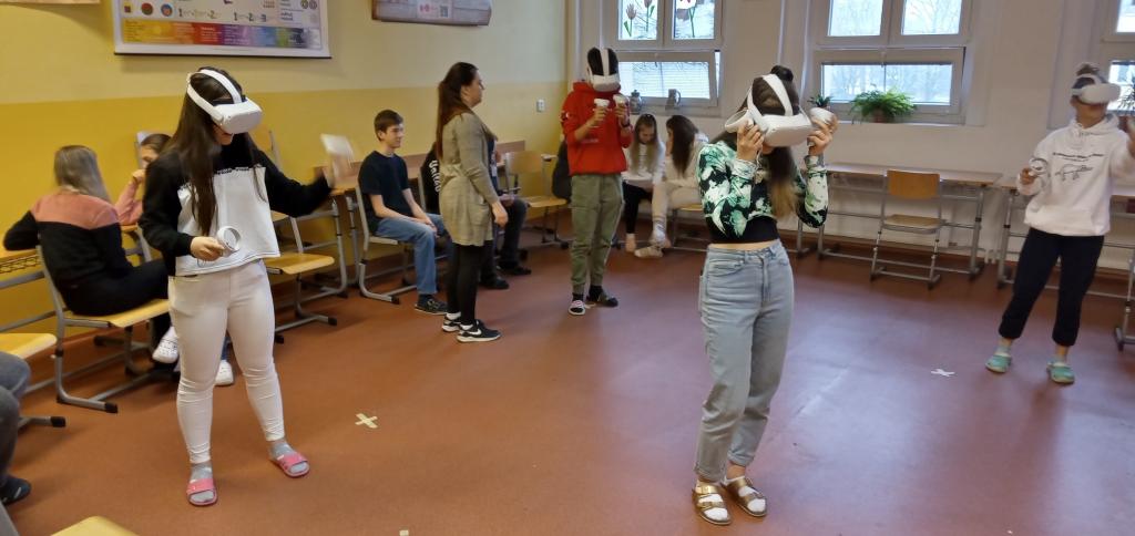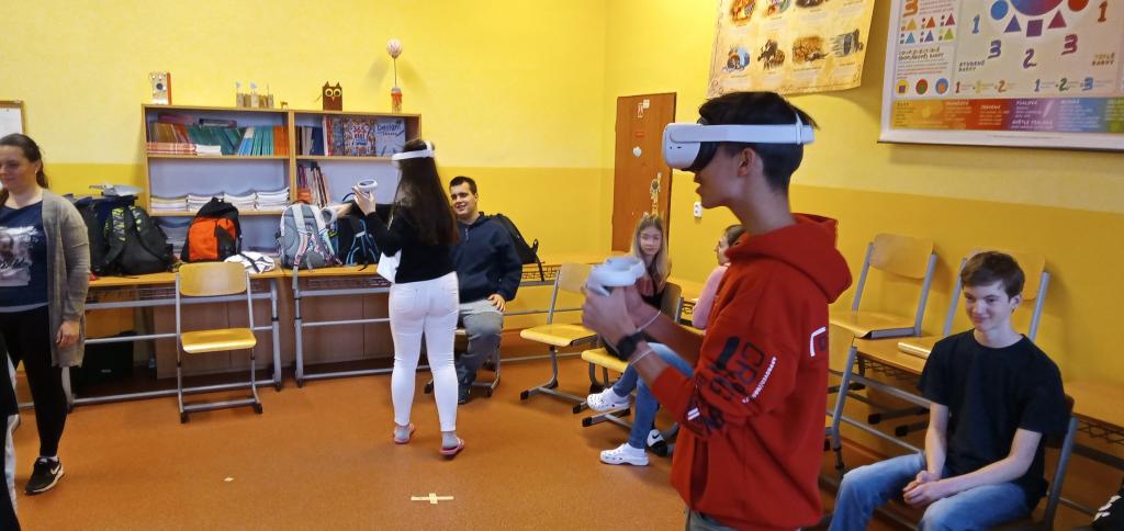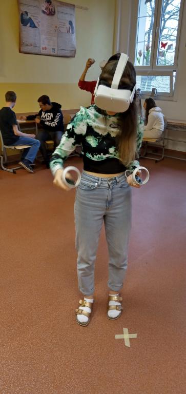 nám předvedly praktické ukázky. A co víc! Všichni žáci, kterým to jejich zákonní zástupci umožnili vyplněním požadovaného prohlášení, si pobyt ve virtuální realitě zkusili na vlastní kůži (tedy spíš oči a ruce).