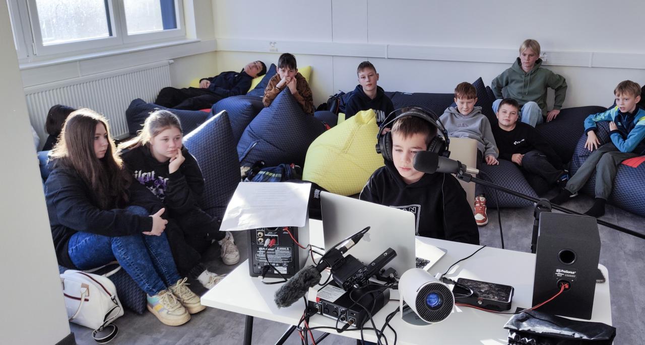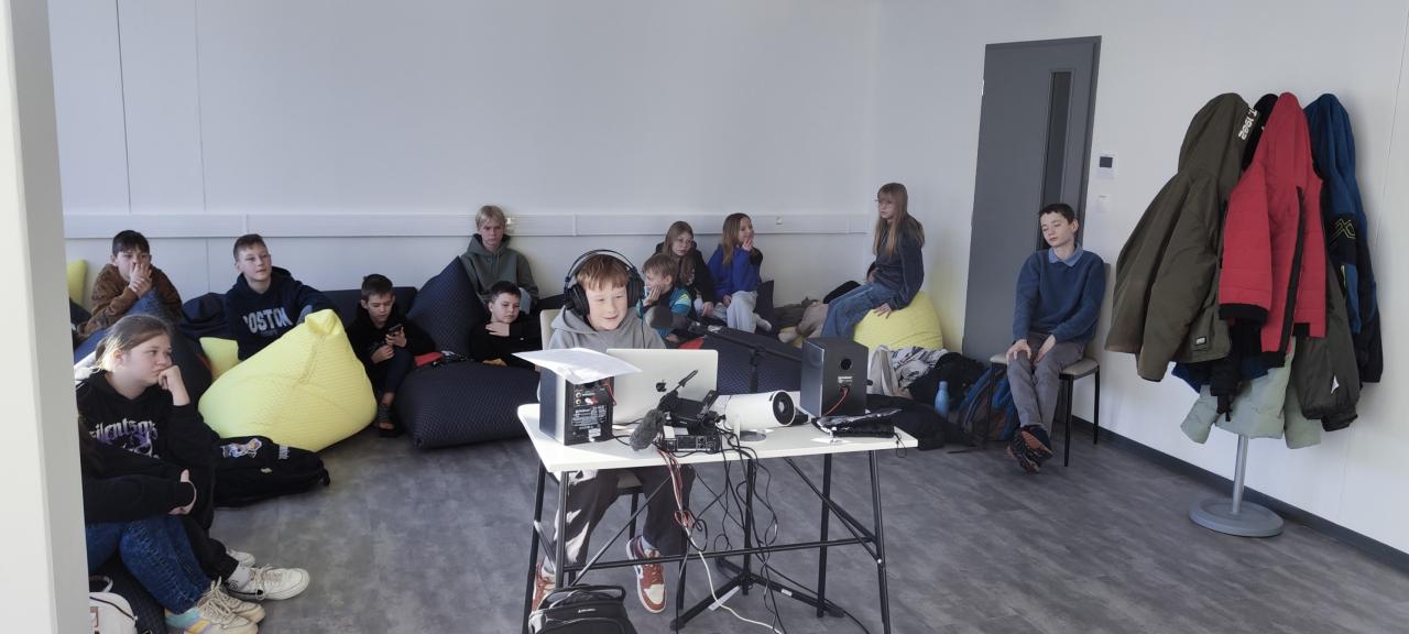 Ředitel firmy pan Strnad ochotně odpovídal na otázky dětí - a že jich nebylo zrovna málo! Skvělé bylo, když si děti mohly prakticky zkusit natáčení profesionální kamerou, vyzkoušet fungování gimbalu a vyvrcholením všech nečekaných zážitků byla možnost namluvit si a poslechnout svoji vlastní reklamní řeč.