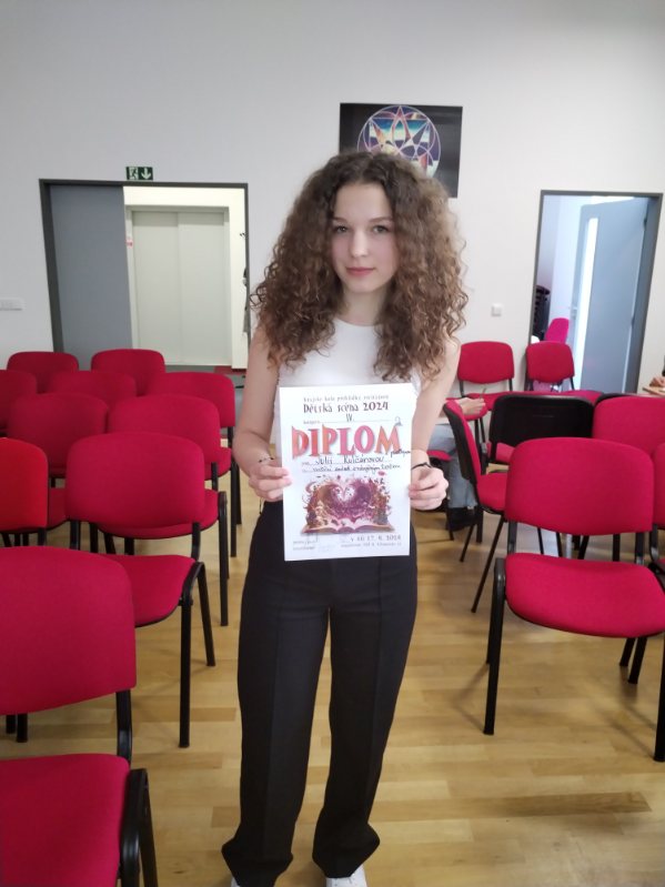 Ve středu 17. dubna 2024 se zúčastnila naše vynikající žákyně Julie Kulčárová z 8. A krajského kola soutěže Dětská scéna 2024 v Aši, kde se utkala s dalšími talentovanými dětskými recitátory z celého kraje.