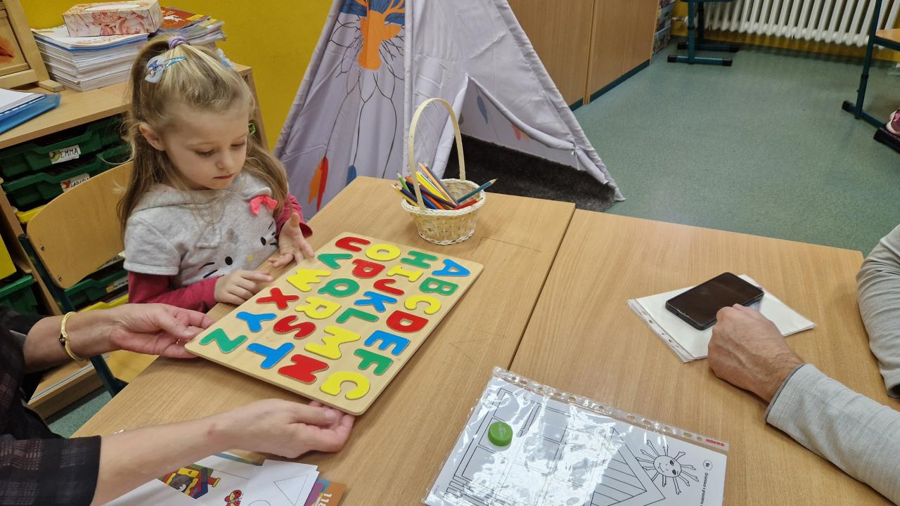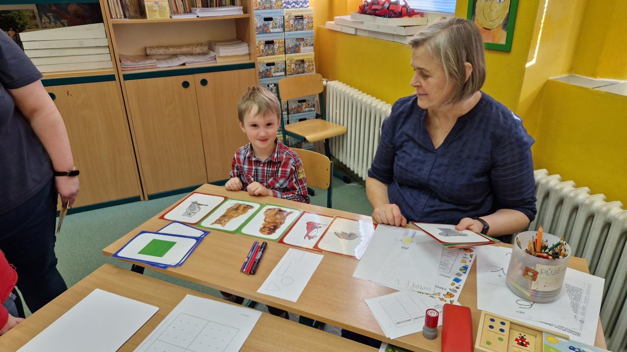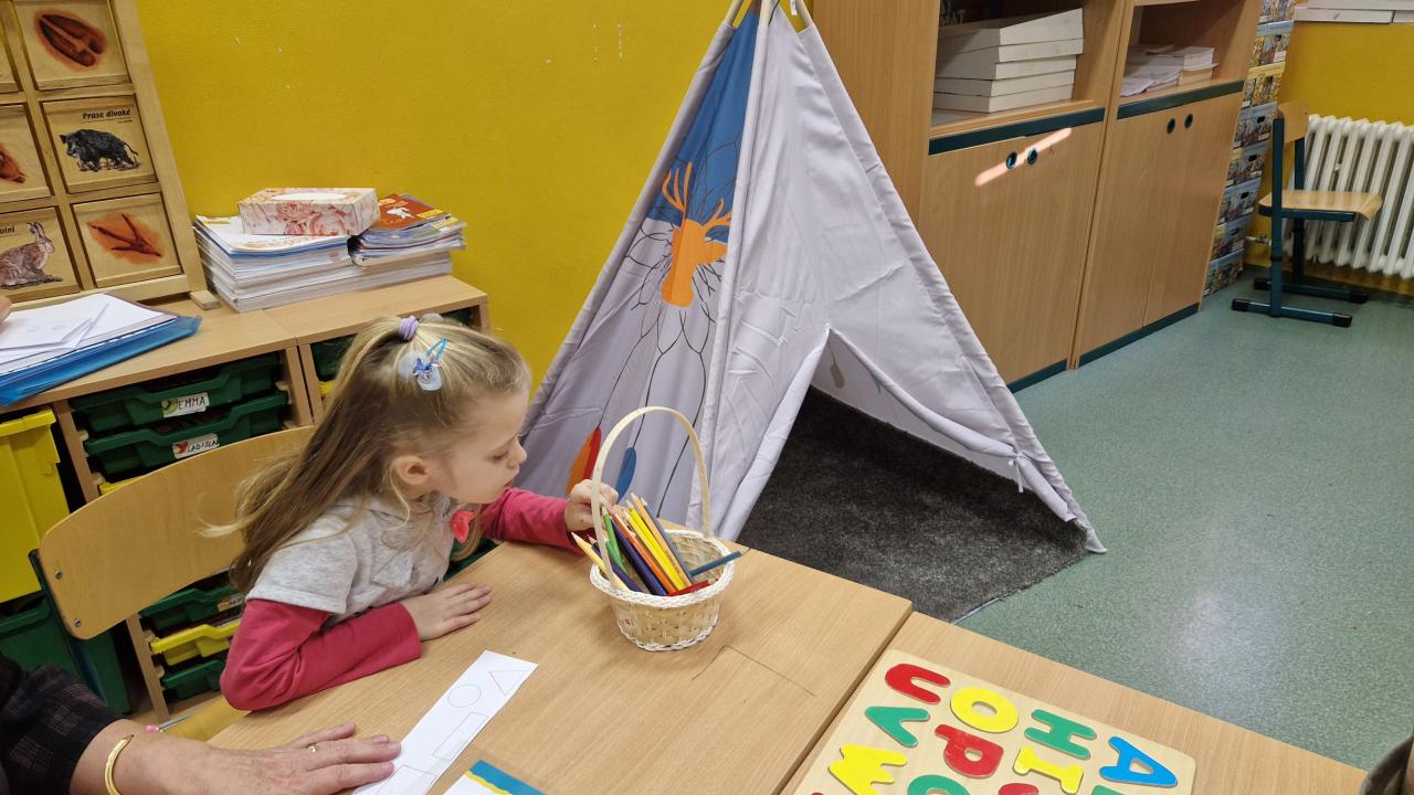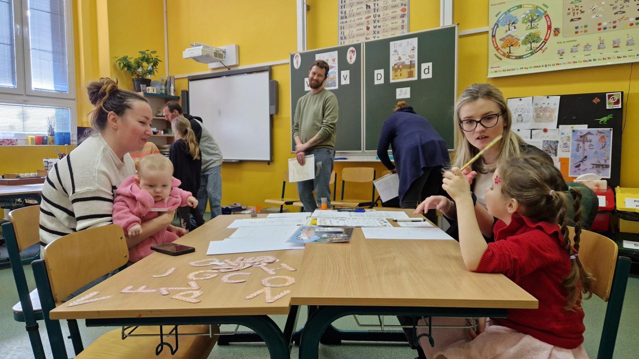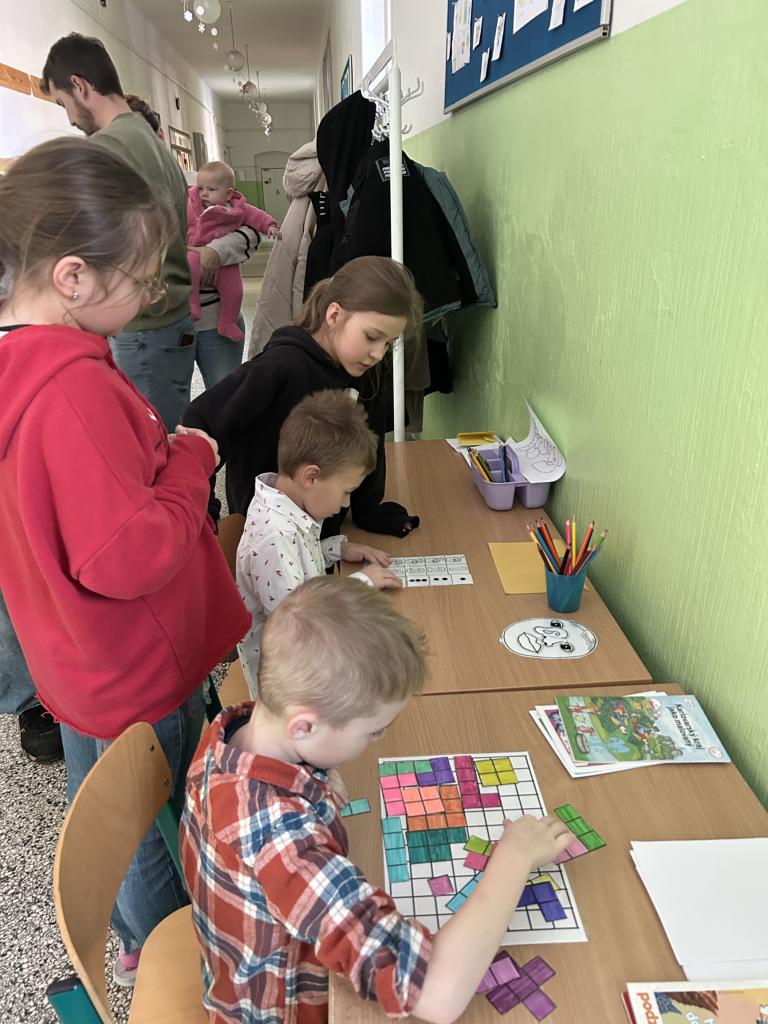 Na chodbě bylo připraveno několik činností tak, aby se děti mohly při čekání zabavit. Některé toho rády využily, jiné se raději držely s rodiči.